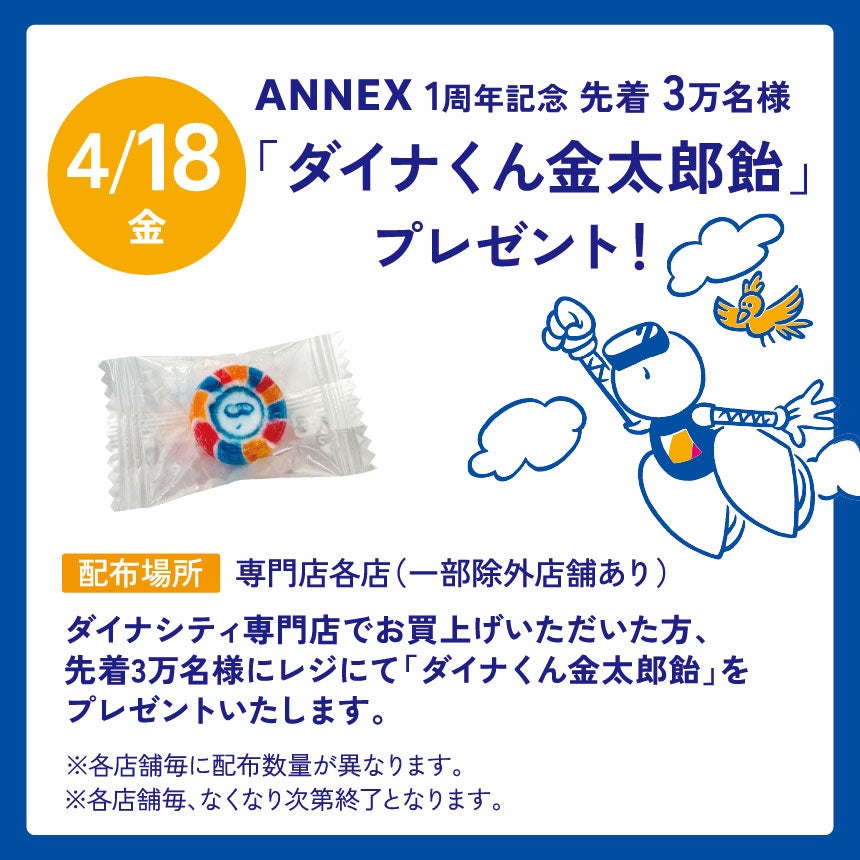 1周年を記念して、ダイナシティ専門店でお買い上げいただいた方、先着3万名様にレジにて「ダイナくん金太郎飴」をプレゼント。