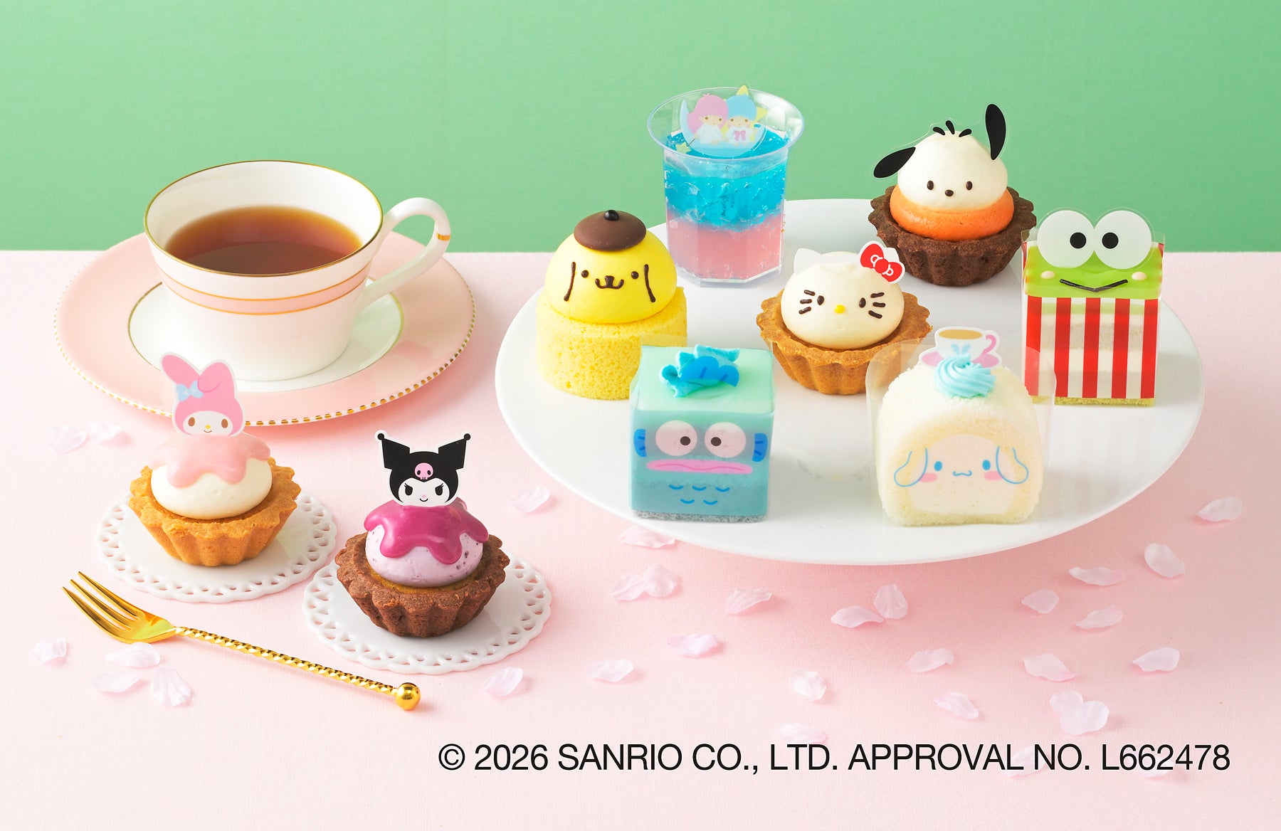 特長:世代を超えて愛されている【サンリオキャラクターズ】とコラボしたプチケーキが登場!それぞれのキャラクターをイメージして、アップルカスタードクリームのタルトや、プリン風味のロールケーキに仕上げました。どのプチケーキもかわいらしく思わず笑顔に。おなじみのキャラクターに癒されながら、楽しいひとときをお過ごしください。