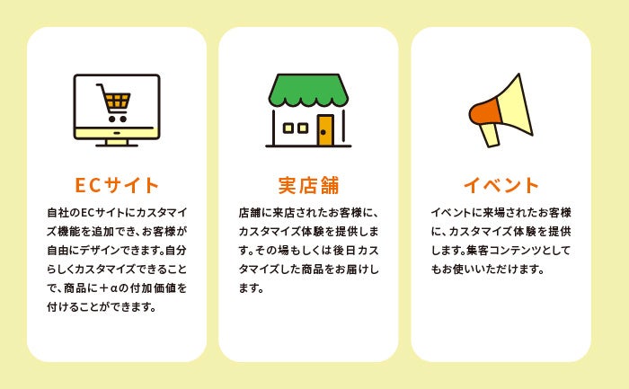 「CustoMee(カスタミィ)」の企業向けサービスは、自社ECサイトや実店舗、イベントなどに「カスタムオーダー機能」を簡単に導入できる仕組みを提供します。