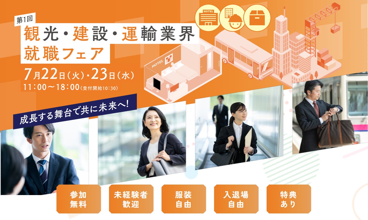 これからの社会に貢献できる「観光」「建設」「運輸」に関わる求人が集まる合同就職説明会/面接会を開催します。未経験でも新しいことにチャレンジしたい方、社会に貢献できる仕事を探している方、持続可能なキャリアを希望する方を応援します。年齢、経験、学歴など問わずどなたでもご参加いただけます。