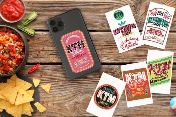 『ケツメイシ TOUR 2024 あっちこっちでマリアッチ♪』のオフィシャルグッズとして販売されているTシャツにも採用されているボトルラベルデザインがステッカーに。全6種類での展開で、スマートフォンの裏面にフィットする名刺サイズとなっています。
