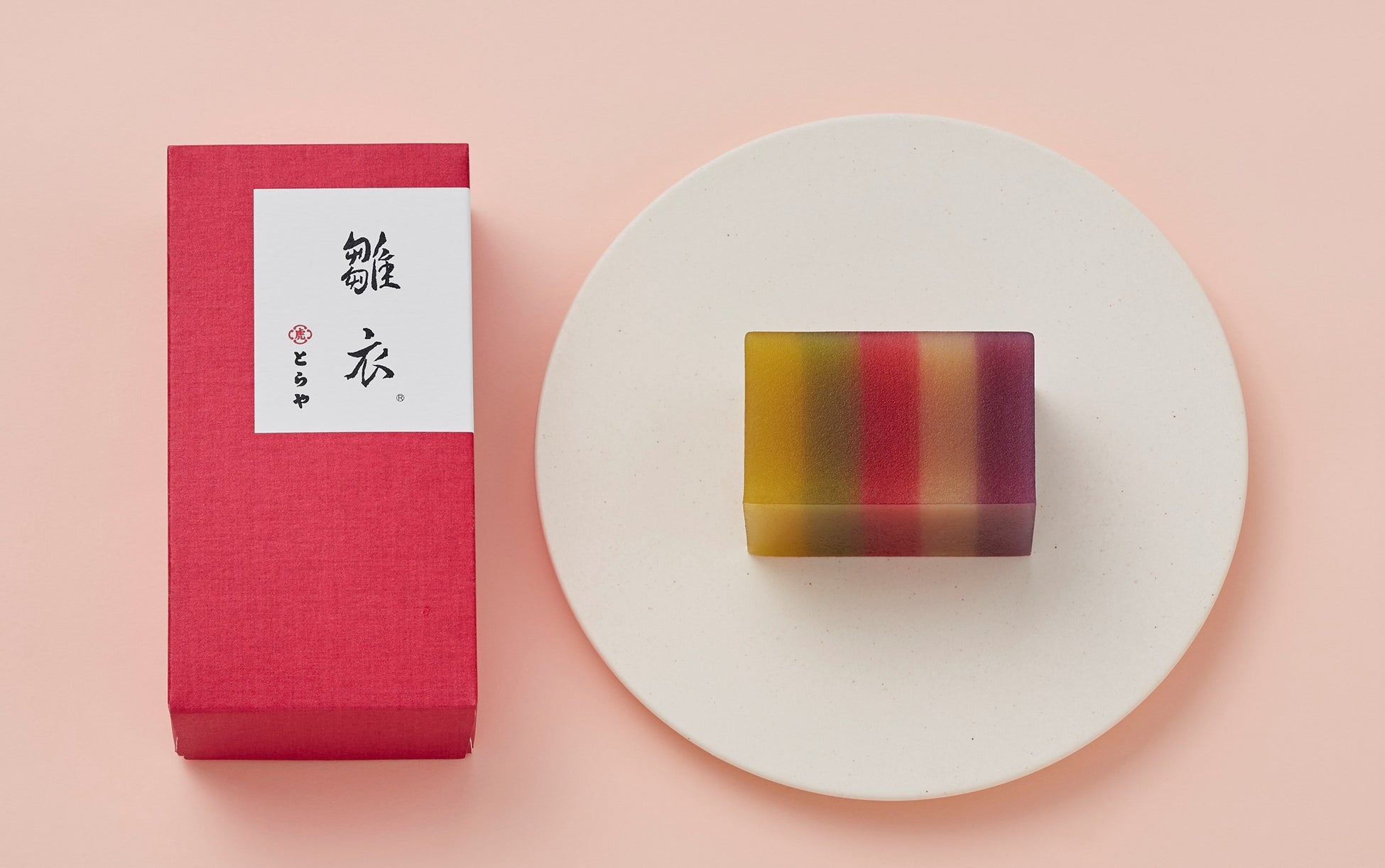 雛まつりにちなんで、おつくりした羊羹です。お雛様の美しく艶やかな衣を黄・緑・紅・白・紫の五色で表しています。
