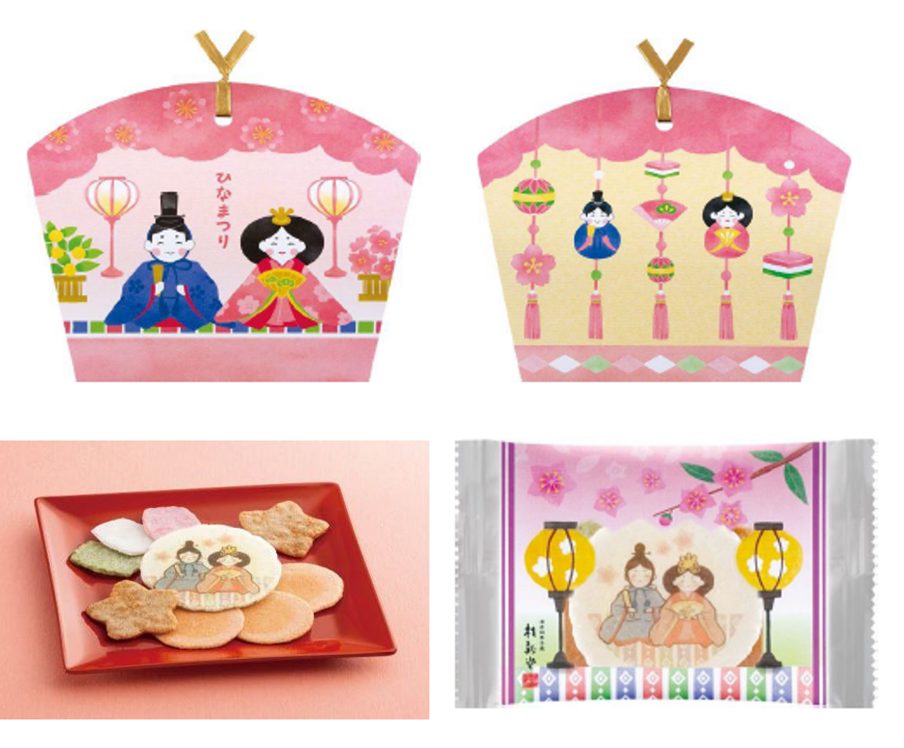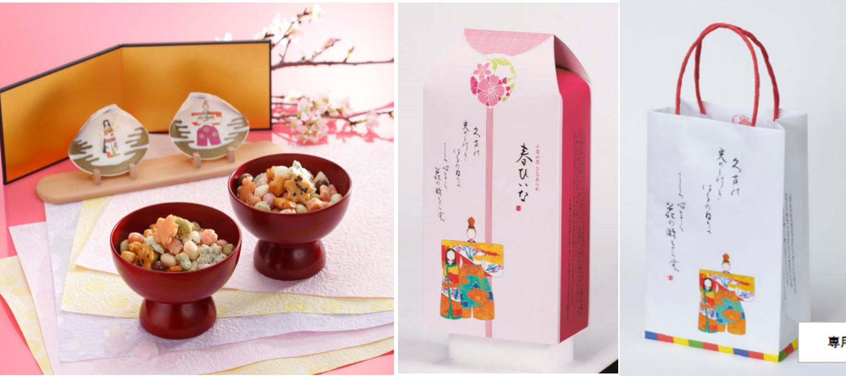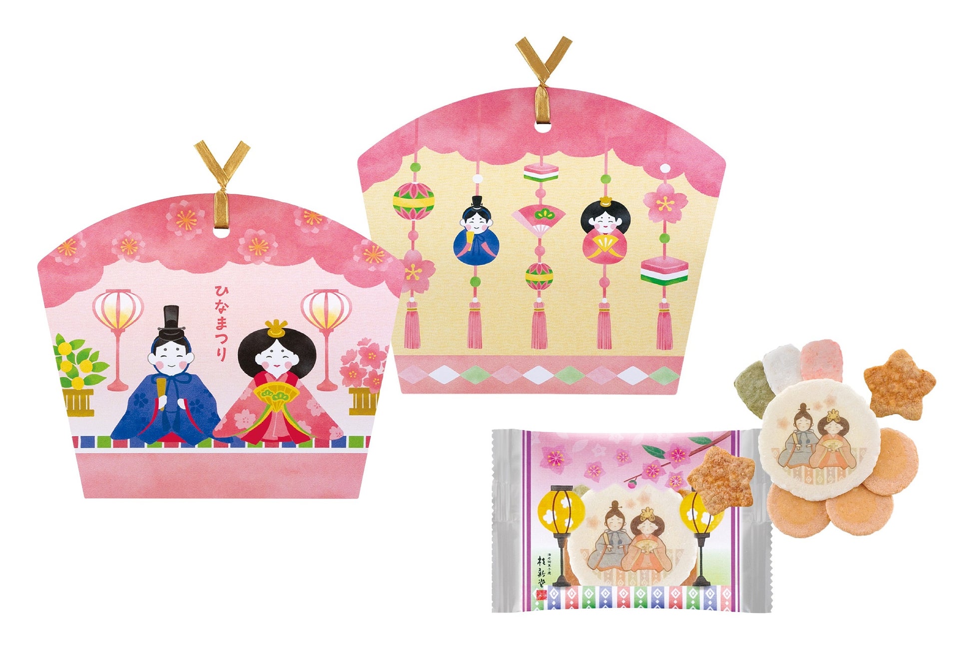 菱餅をイメージしたえびせんべいとお雛様、お内裏様、桃型の炙り焼きが入った可愛らしいお品です。