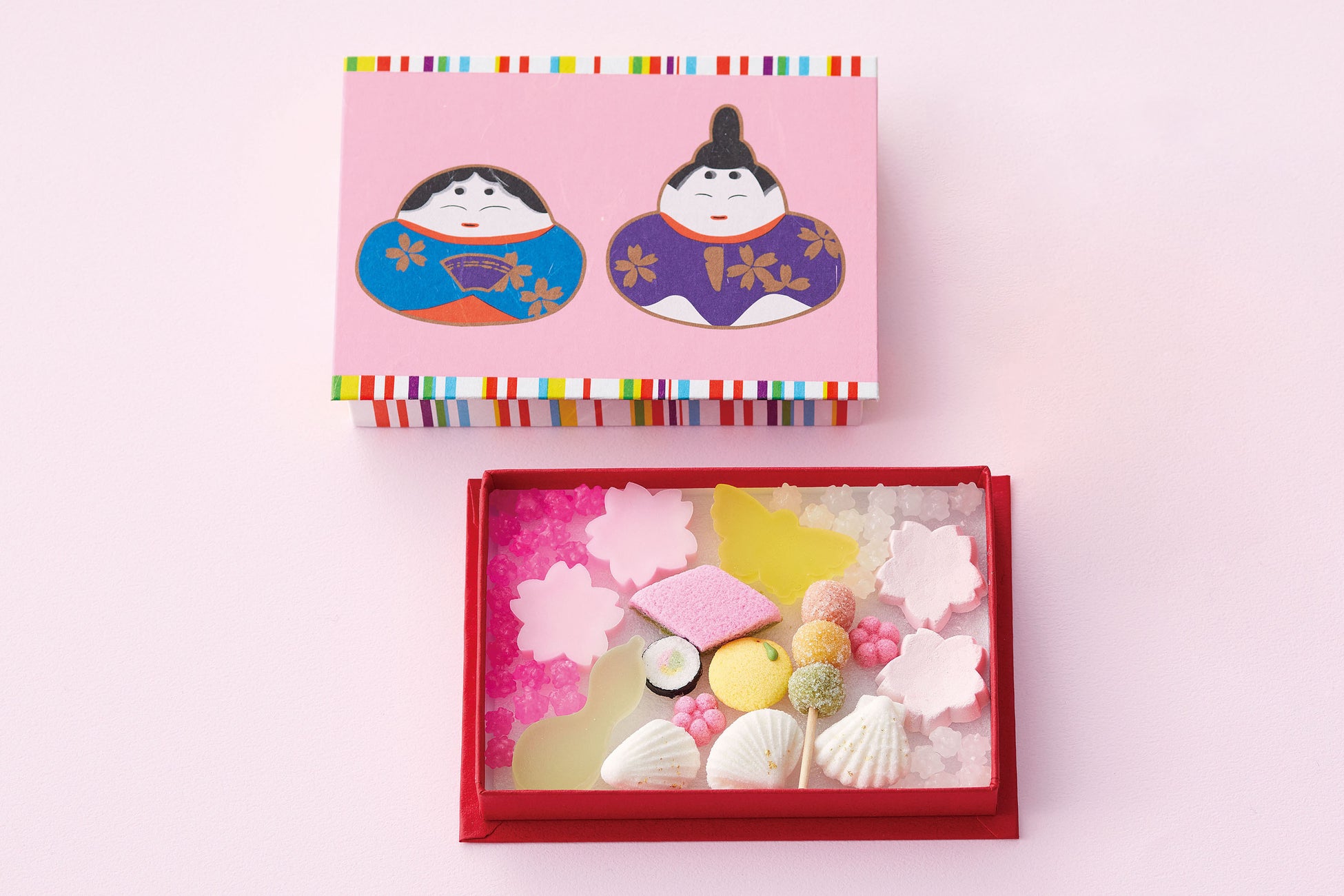 桃の節句を祝う、とりどりのお干菓子をお内裏様とお雛様の可愛い小箱に詰めて。