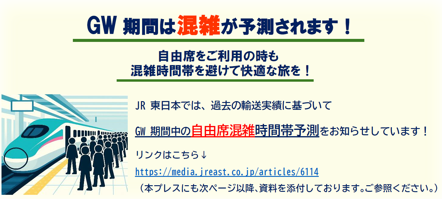 例年、ゴールデンウィーク期間中は多くのお客さまから新幹線指定席のご予約をいただいています。既に需要が集中する時間帯の新幹線は満席になっているため、自由席でご移動されるお客さまが多く見込まれます。