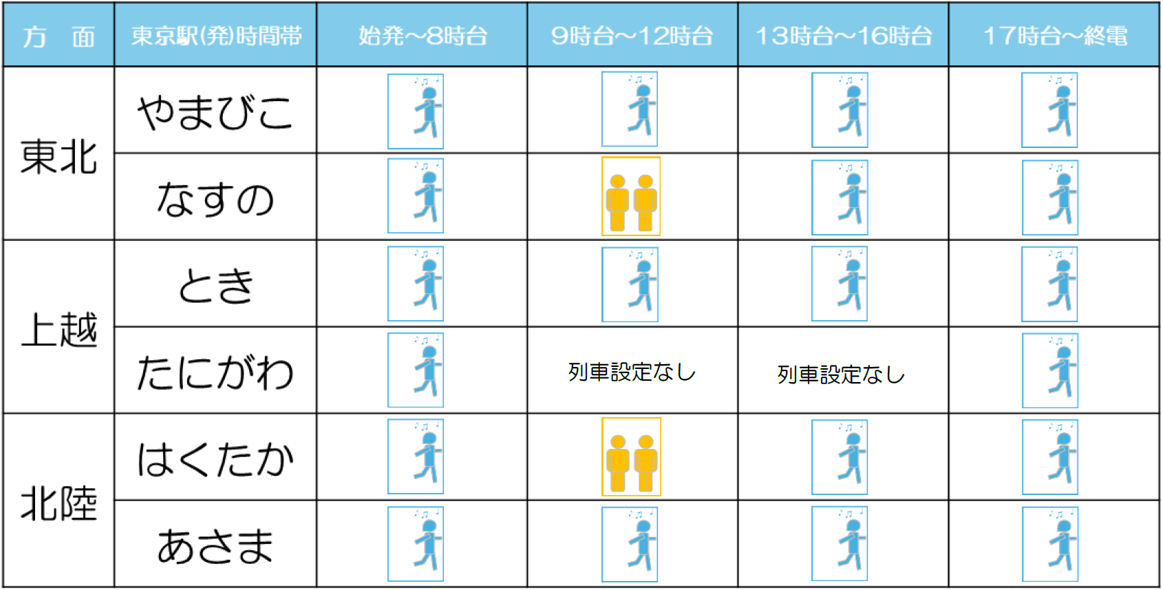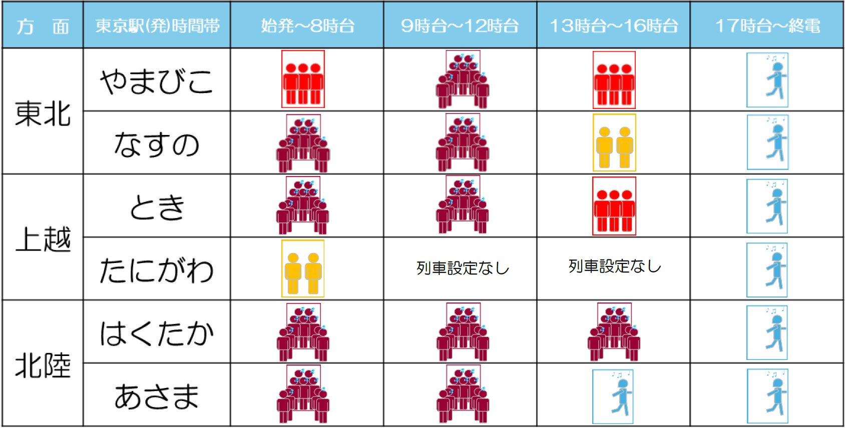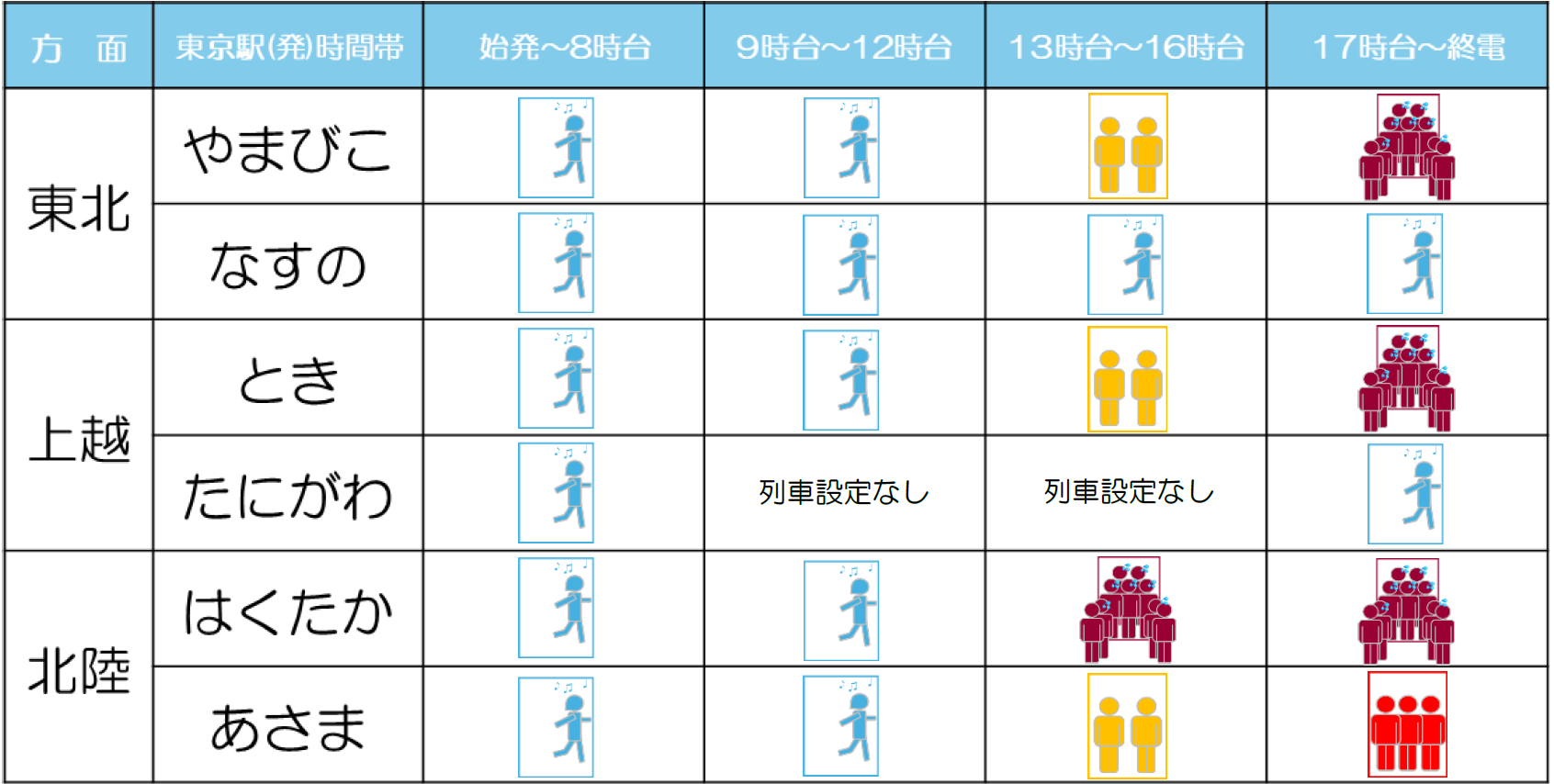 北陸新幹線は「はくたか」の混雑が目立ちます。長野・軽井沢からご利用の方は「あさま」の自由席が比較的余裕がある予測です。