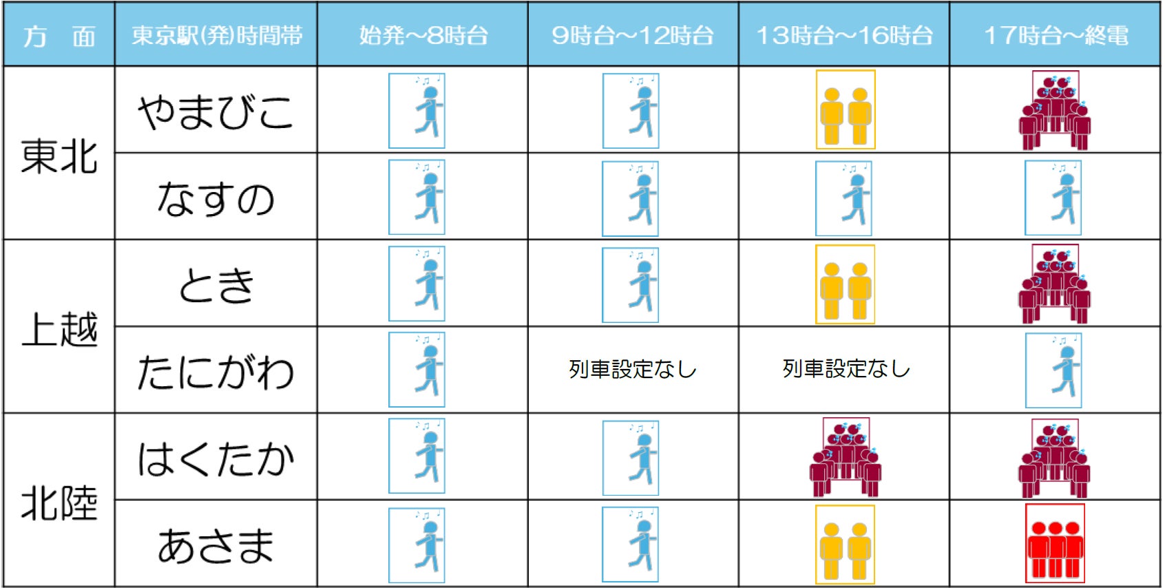 連休前日の午後から混雑が始まります。東北新幹線の郡山までは「なすの」、上越新幹線の越後湯沢までなら「たにがわ」、北陸新幹線の長野までなら「あさま」の自由席が比較的余裕がある予測です。