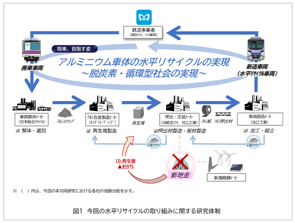 東京地下鉄株式会社(本社:東京都台東区、代表取締役社長:小坂 彰洋、以下「東京メトロ」)、メトロ車両株式会社(本社:東京都台東区、代表取締役社長:中澤 英樹、以下「メトロ車両」)、株式会社ホンダトレーディング(本社:東京都千代田区、代表取締役 社長執行役員 :夏目 達也、以下「ホンダトレーディング」)、日本総合リサイクル株式会社(本社:富山県高岡市、代表取締役社長:高倉 康氏、以下「日本総合リサイクル」)、日軽金アクト株式会社(本社:東京都港区、代表取締役社長:五百竹 秀夫、以下「日軽金アクト」)、住江工業株式会社(本社:京都府京田辺市、代表取締役社長:小野 博富、以下「住江工業」)は共同で、半蔵門線8000系車両から半蔵門線18000系車両へのアルミニウム水平リサイクル※1を実現しました。