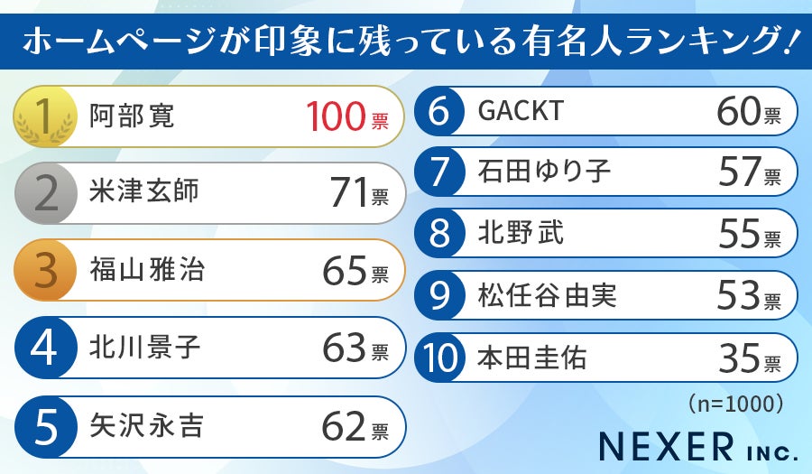 【男女1000人に聞いた】ホームページが印象に残っている有名人ランキング!