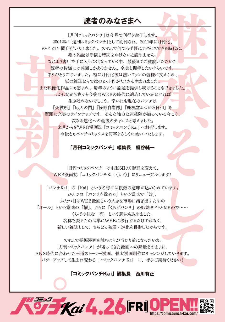 「月刊コミックバンチ」として最終号となる5月号(3月21日発売)では、両編集長のコメントと共に「コミックバンチKai」の新連載情報や新作のプロローグを巻頭&巻末カラーで掲載。