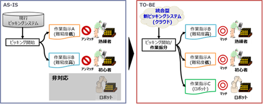 作業難易度と作業員の熟練度に応じた自動指示機能を導入し、作業内容に適した人員の割り当てやロボットへの指示ができるようになりました。