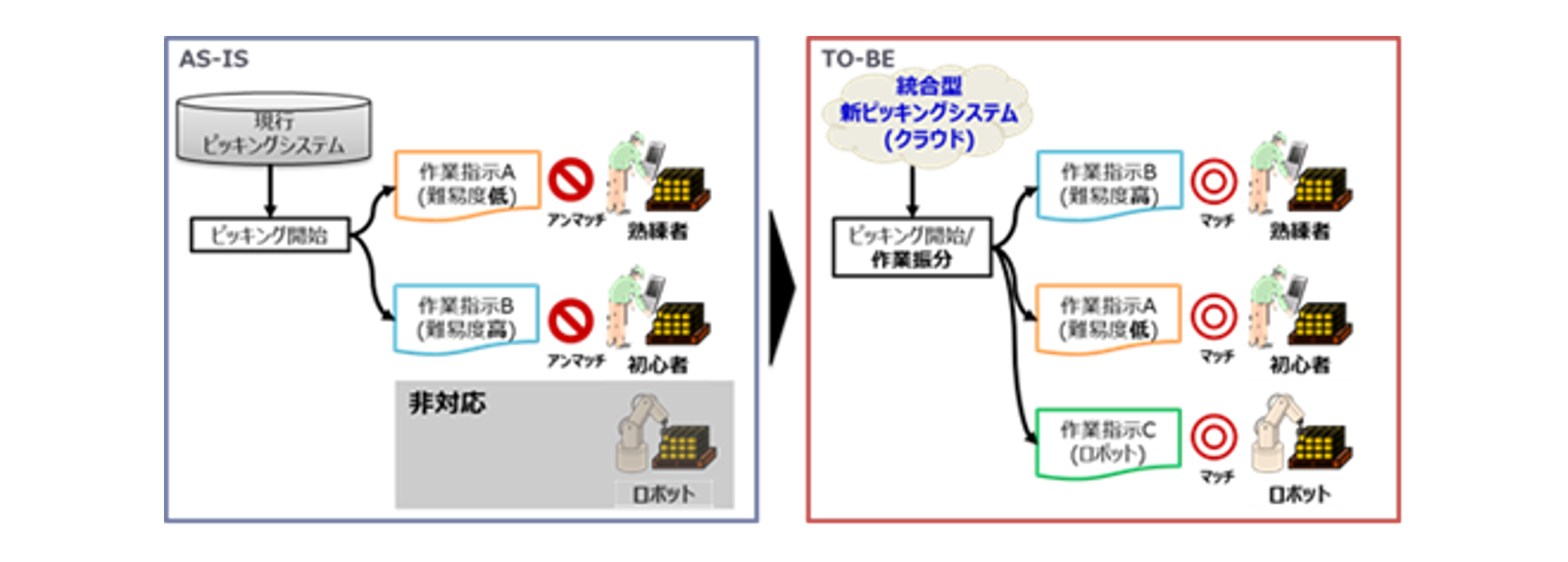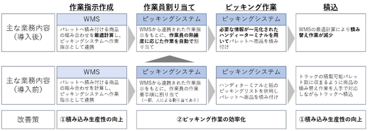 ピッキングとは、倉庫管理システム(Warehouse Management System 以下、WMS)からの指示に基づき、商品の出荷作業工程において倉庫内で対象商品をパレットに積みつける作業です。本システムの導入により、人とロボット両方へ効率的かつ最適な積み付けの指示をすることが可能となりました。