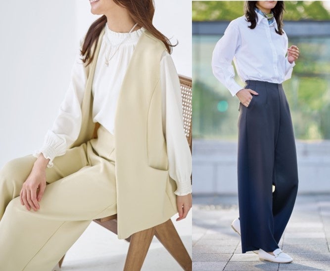 やわらかくてストレッチ感があり、しわが目立ちにくい素材。パンツは好みに合わせてレギュラー丈・ロング丈からお選びいただけます。
