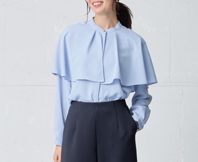 ケープ襟がフェミニンな印象ながらもきちんと感のあるデザイン。1枚でも華やかで着映えする万能ブラウス。