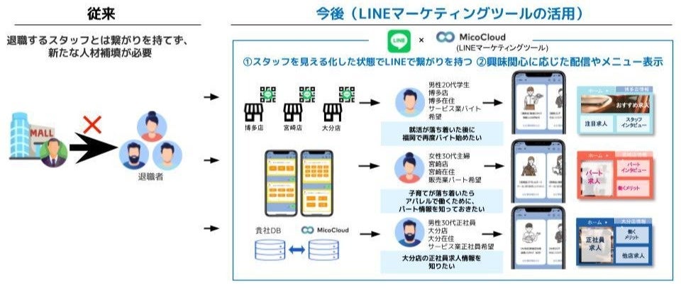 アミュプラザで働いたことがある方を主な対象に、採用に特化したLINE公式アカウントをリリースし、アイデムが運用代行します。これまでは、新たな人材を一から採用していましたが、今後はWワーク希望者や退職するスタッフとも関係を構築し、タイムリーな配信で採用につながる仕組みを提供します。