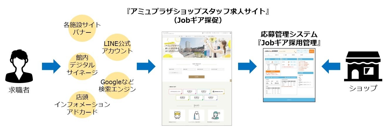 より有効でニーズにあったショップスタッフ採用活動支援を目的に、アイデムは、求人総合サイト及びアミュプラザ勤務経験者を主対象とするLINE公式アカウントの新規開設と運用を総合的にサポートします。当社の長年にわたる人材採用のノウハウを活用することで、採用活動を迅速かつ効果的に実施し、テナントの負担軽減に寄与すると共に 地域の活性化を目指します。