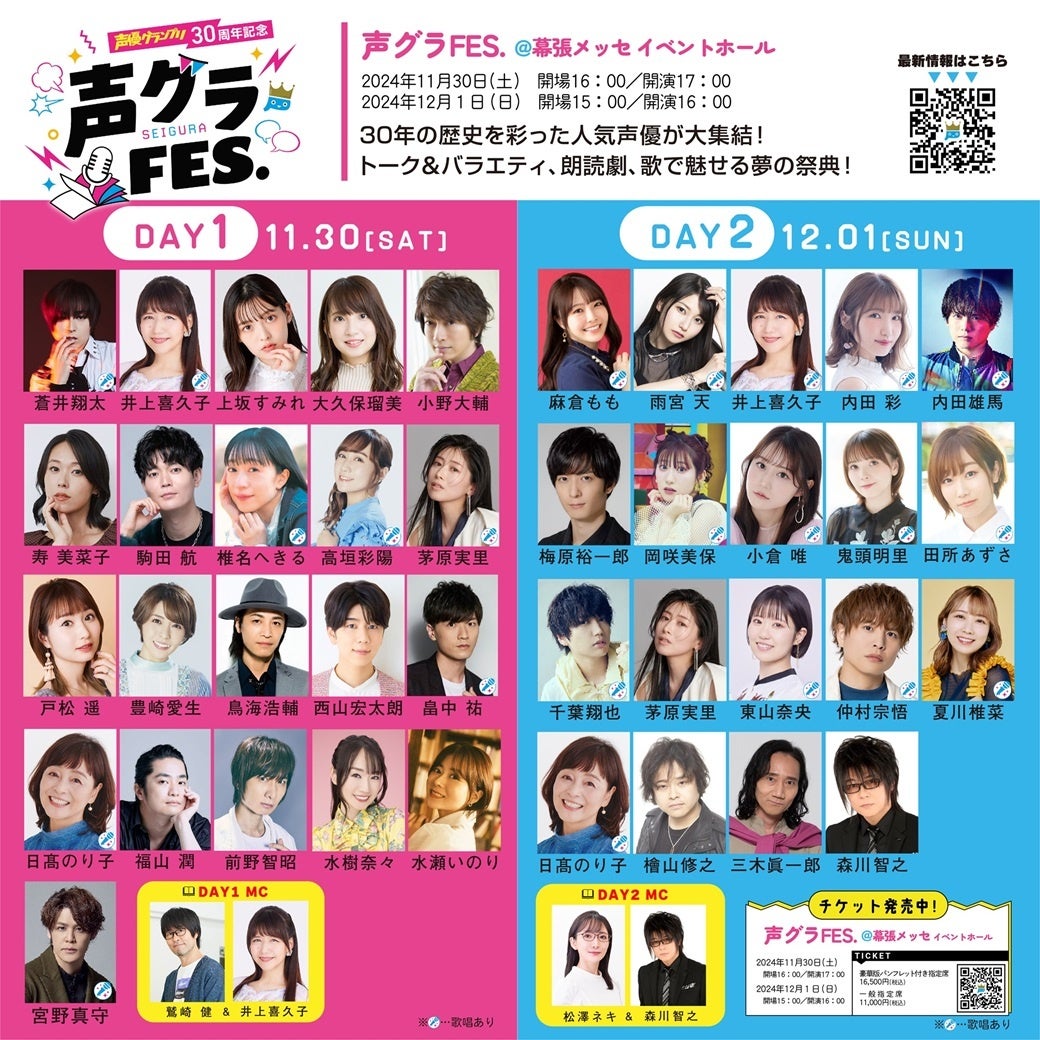 また、30周年を迎える『声優グランプリ』は、11月30日(土)、12月1日(日)に千葉・幕張メッセイベントホールにて記念イベント『声グラFES.』を開催。声優グランプリを盛り上げてきた超人気声優陣がトークと朗読とライブで競演する。ライブではコラボ曲にも注目だ。こちらのイベントチケットも好評発売中。