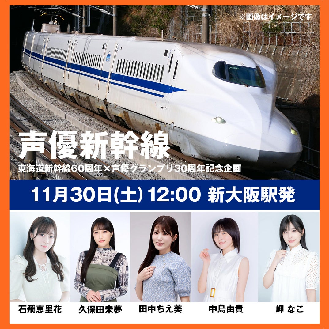 さらに、11月30日(土)には、東海道新幹線開業60周年と声優グランプリ創刊30周年を記念した「声優新幹線」も運行。人気女性声優5名が新幹線乗務員の制服を着て同乗し、全車両を巡って挨拶を行うほか、楽しい企画が盛りだくさん。こちらの乗車チケットは11月11日(月)いっぱいまでの受付となっている。