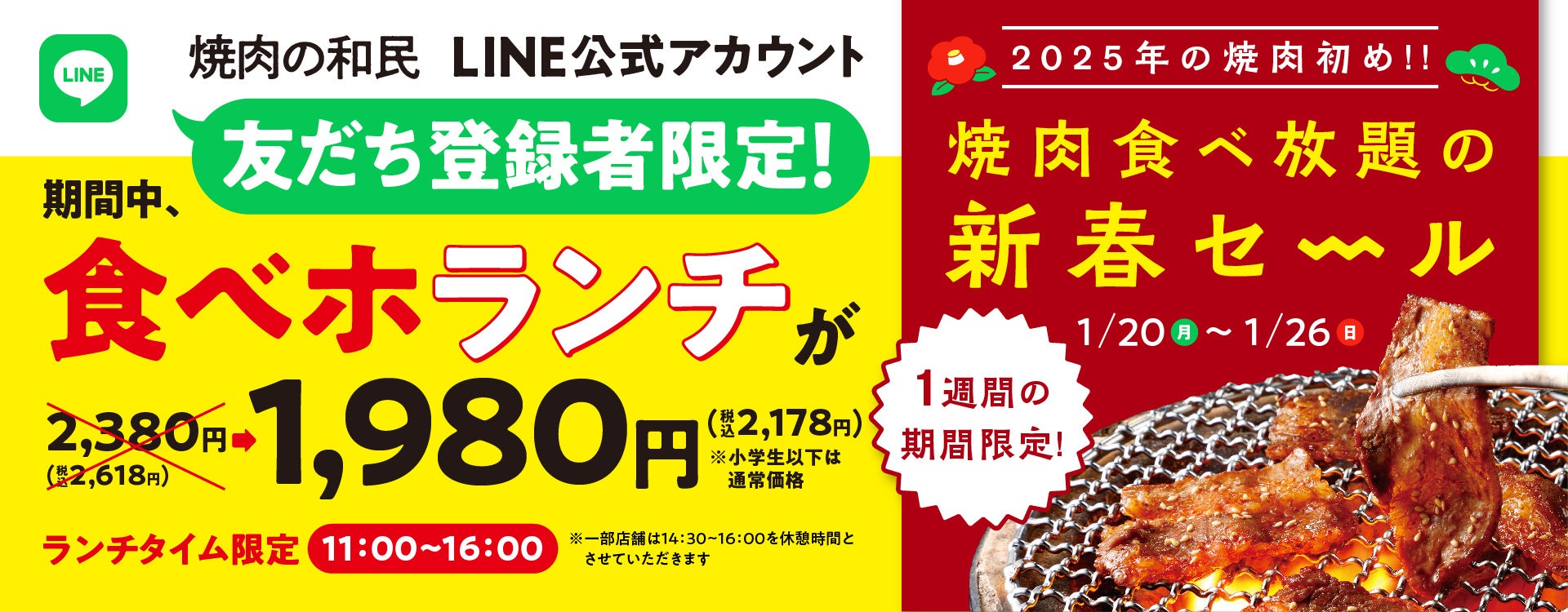 『焼肉の和民』LINE公式アカウント友だち登録者様限定‼ランチタイムの食べ放題プランを7日間限定で1,980円(税込2,178円)で楽しめる新春セール開催!2025年の焼肉初めはこれで決まり!