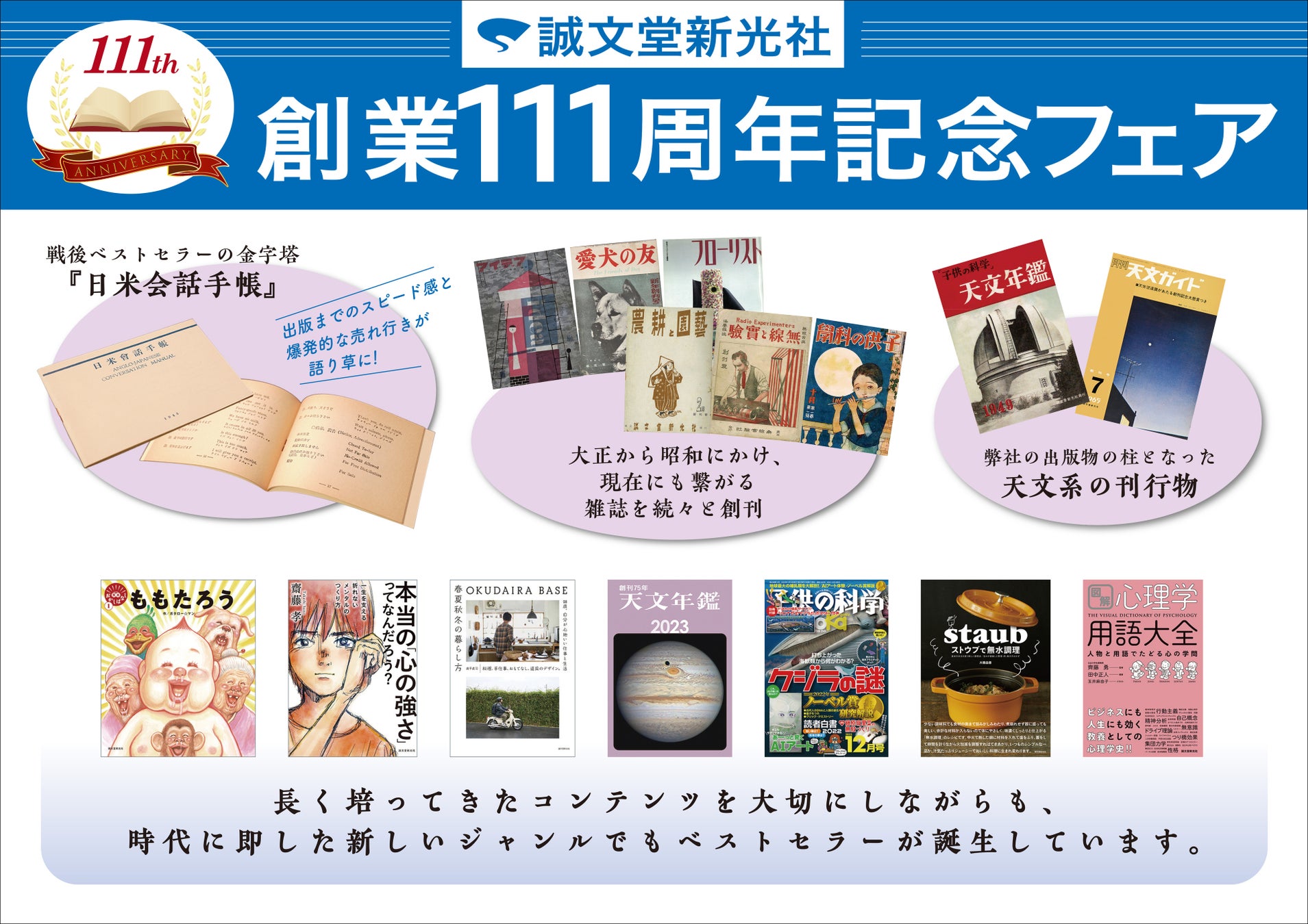 株式会社誠文堂新光社(東京都文京区、代表取締役:小川 雄一)は、2022年に創業110周年を迎え、2023年は創業111周年と、記念すべきゾロ目の年を迎えることとなりました。これを記念し、「創業111周年記念フェア」を全国の書店様で2023年1月下旬より順次開催いたします。