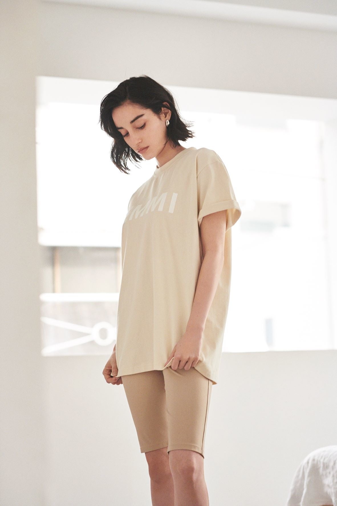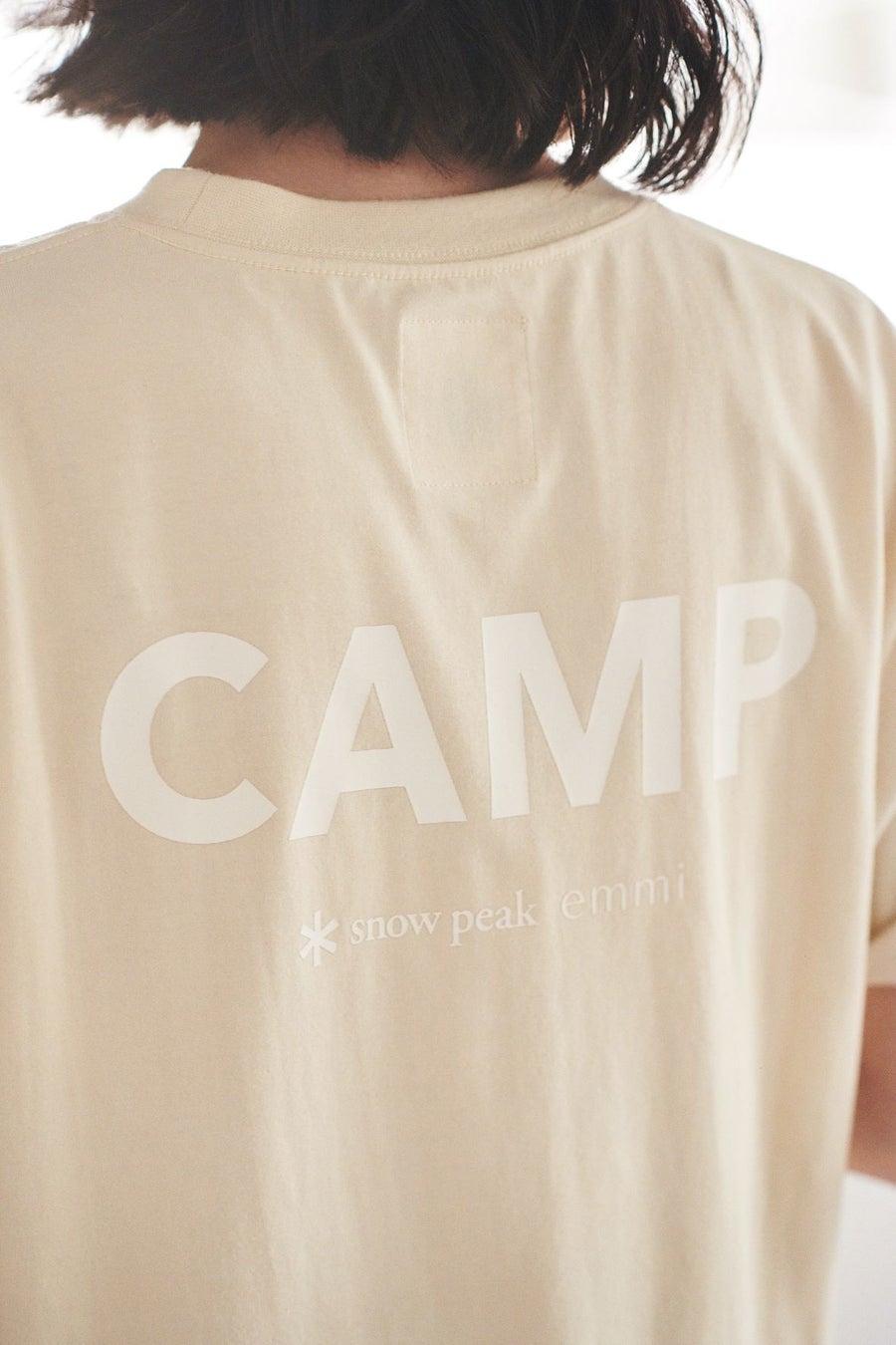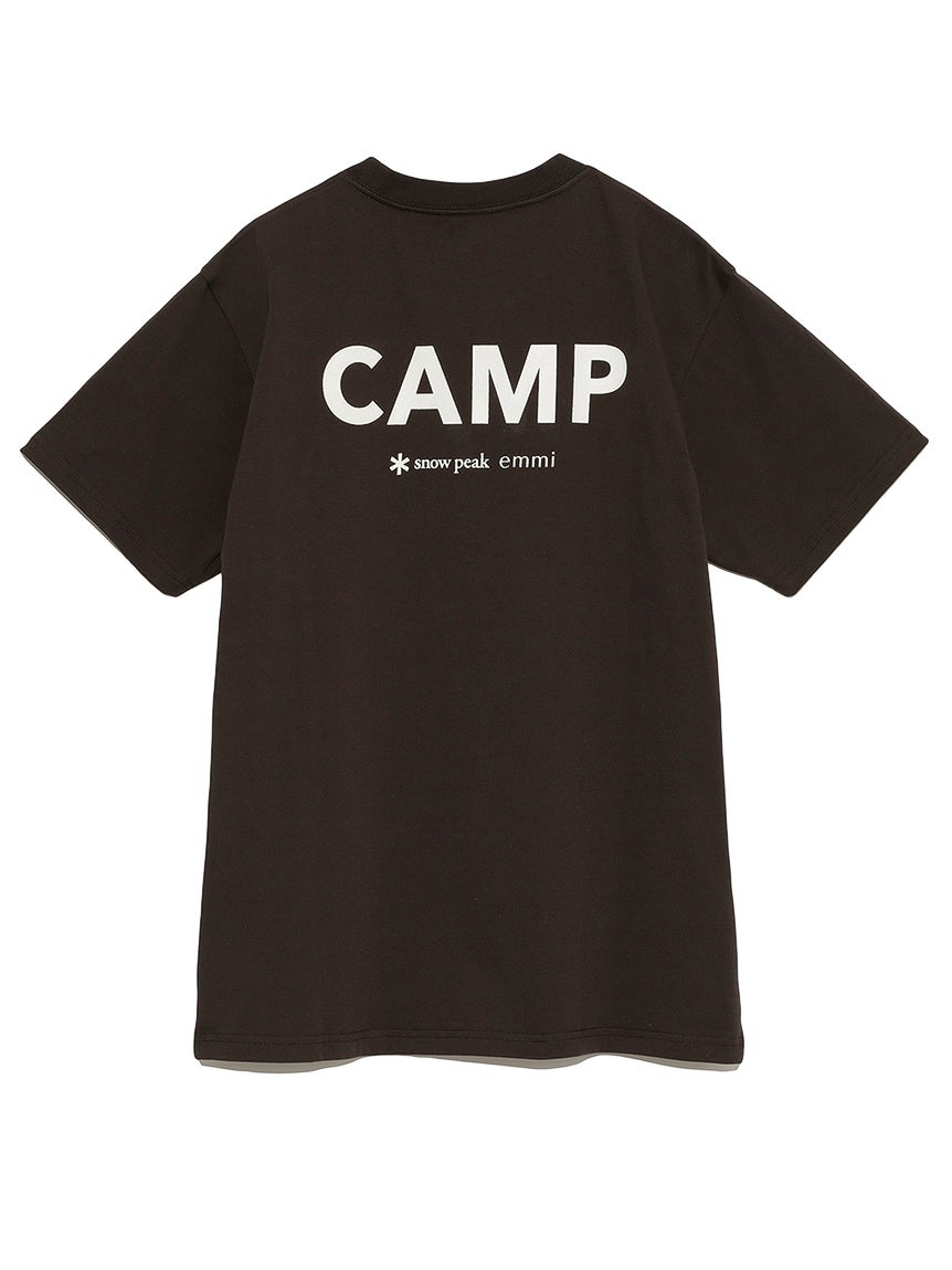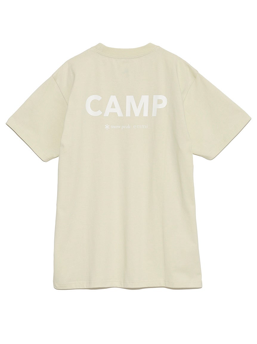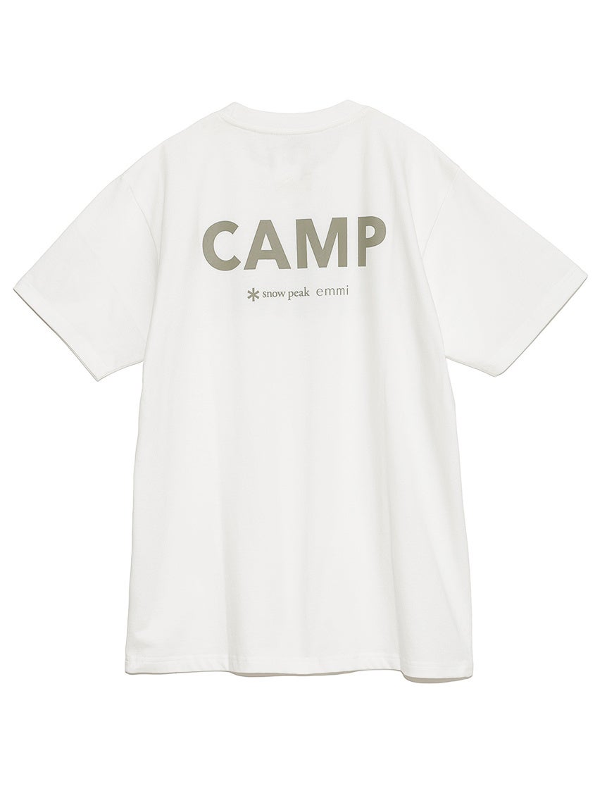 EMMIとCAMPのロゴを大胆にプリントしたTシャツは肌なじみの良いコットン素材を使用。