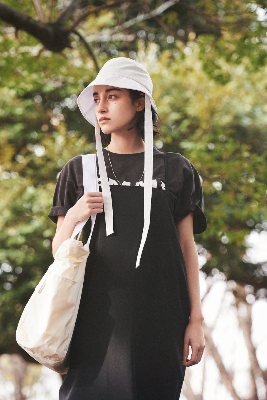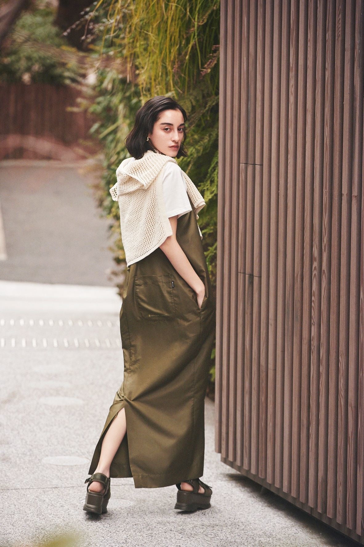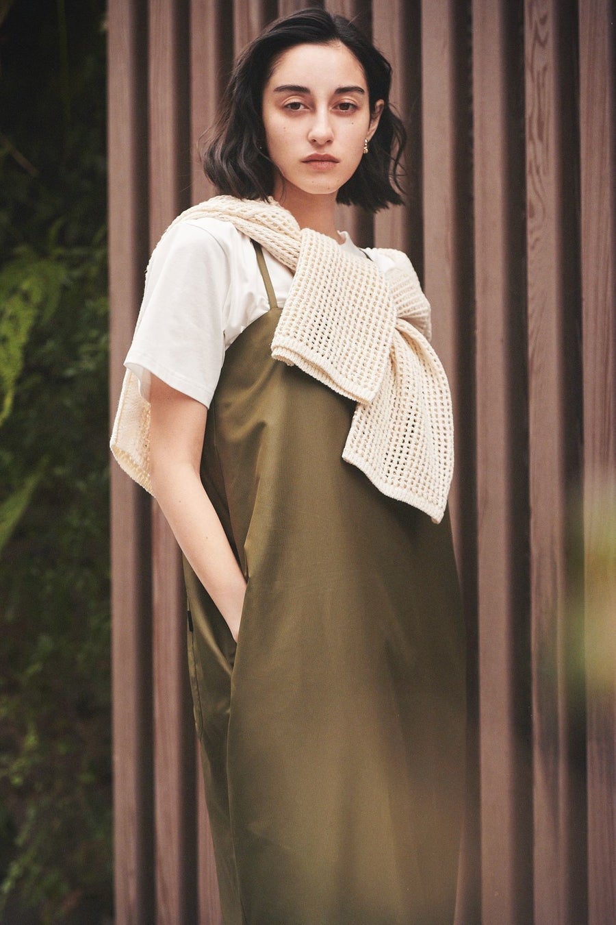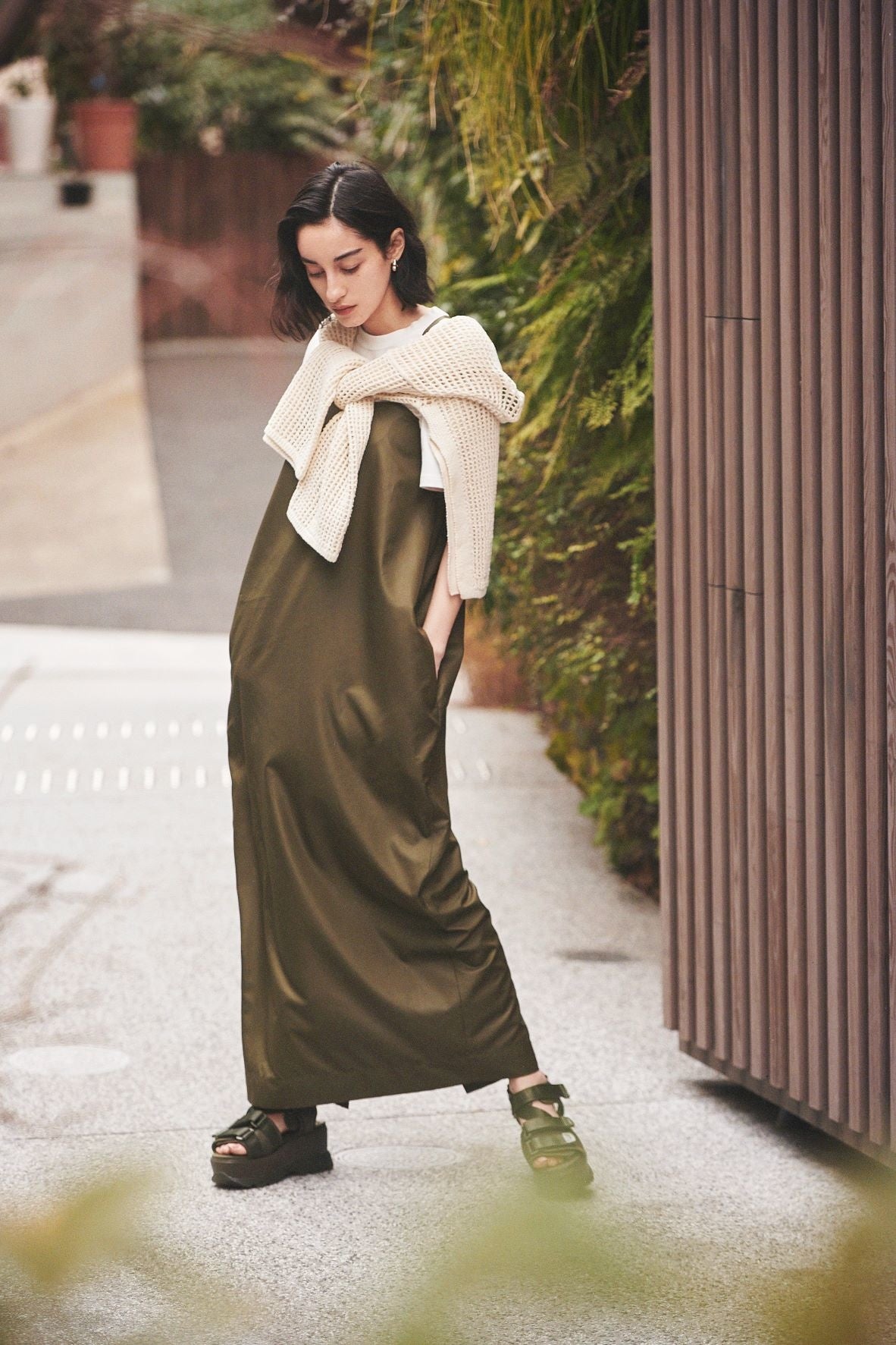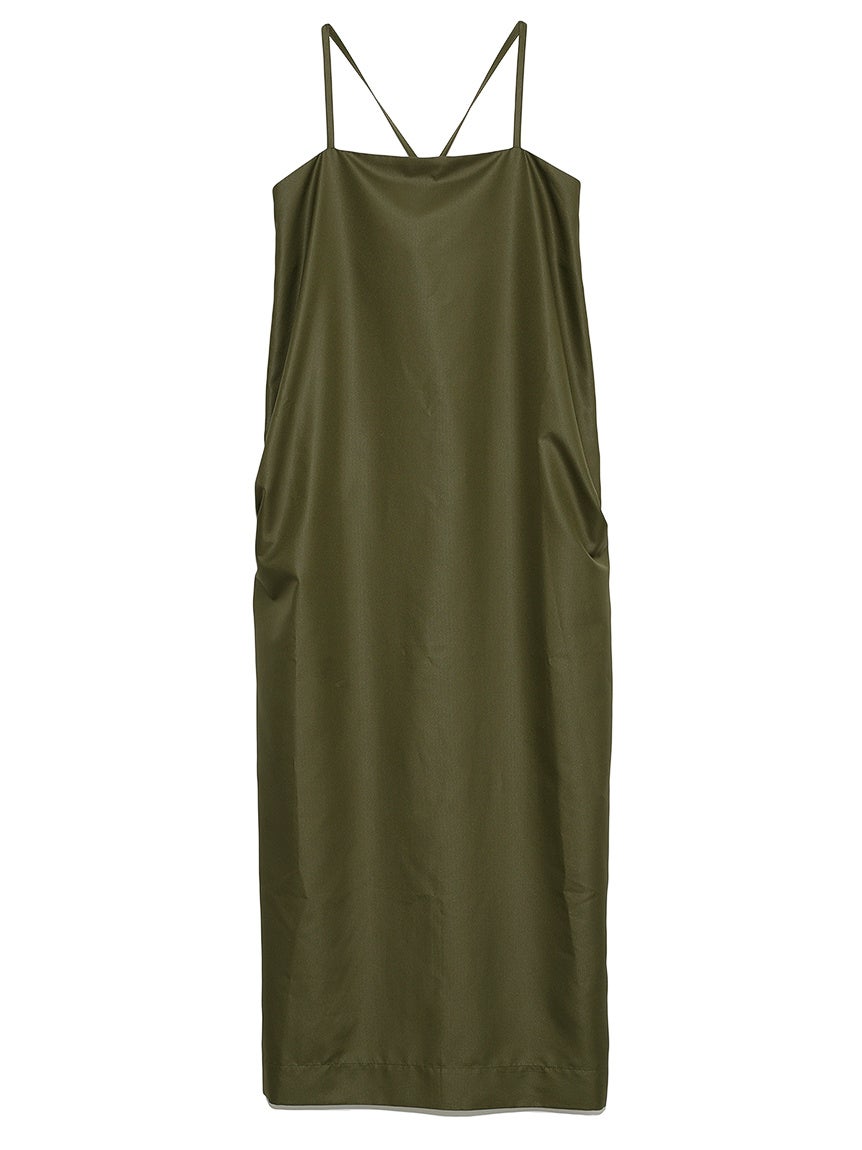 emmiらしくモード感の漂うコクーンシルエットに仕上げたキャミソールワンピース。