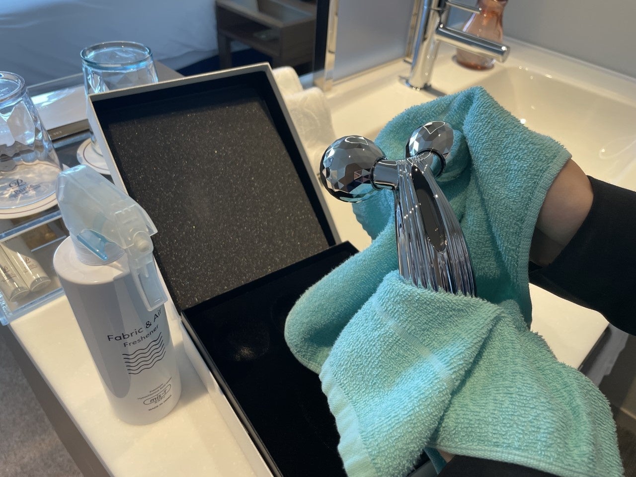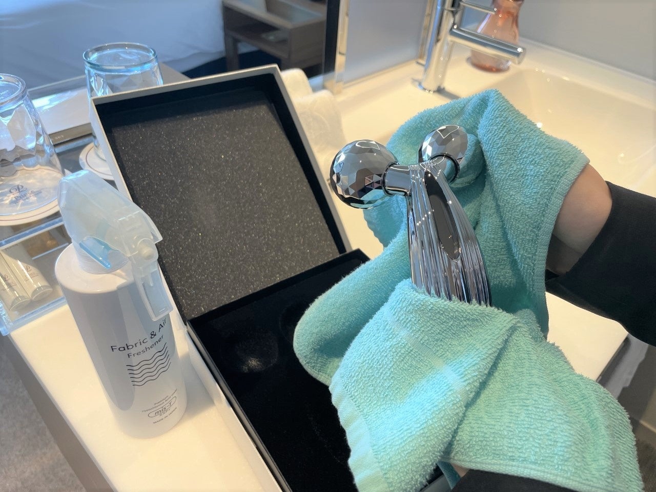 全てのReFa商品は、次亜塩素酸水で消毒をしております。また、客室内にも次亜塩素酸水をご用意しておりますので、複数名でのご宿泊の場合も安心してご利用いただけます。