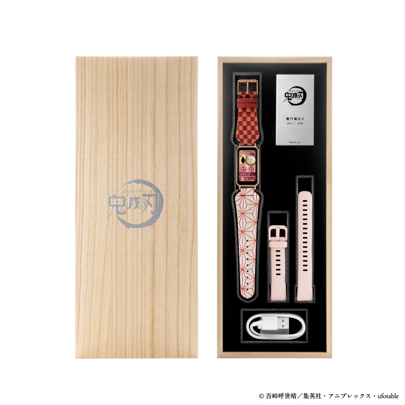 【商品詳細】 商品名:鬼滅の刃スマートウォッチ 「竈門炭治郎」モデル KY001-T/「竈門禰豆子」モデル KY002-N 価格:各35,200円(税込) 詳細ページ https://www.garrack.jp/kimetsu/ 液晶サイズ: 43,45 × 24,54 × 8,99 mm(1.47インチAMOLED) ベルトの長さ: コラボベルト 上72 mm 下116 mm 交換用ベルト: 130 - 210 mm(竈門炭治郎モデル)/120 - 190 mm(竈門禰豆子モデル) 素材: ケース:耐久性ポリマー/コラボベルト:西陣織・カーフレザー/交換用ベルト:TPUストラップ(竈門炭治郎モデル)、シリコンストラップ(竈門禰豆子モデル) 付属品:専用桐箱ボックス/充電ケーブル/交換用ベルト/保証書/クイックスタートガイド/設定ガイドQR&西陣織の注意事項/シリアル番号入りプレート |