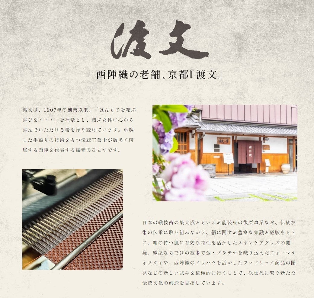 また、ベルトには1907年に創業し、卓越した手織りの技術をもつ西陣織の名門、京都・『渡文』