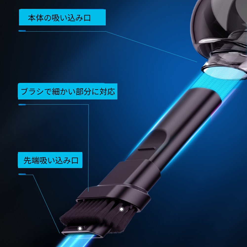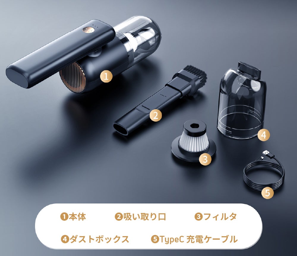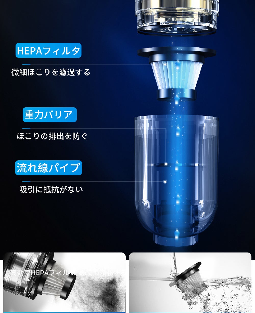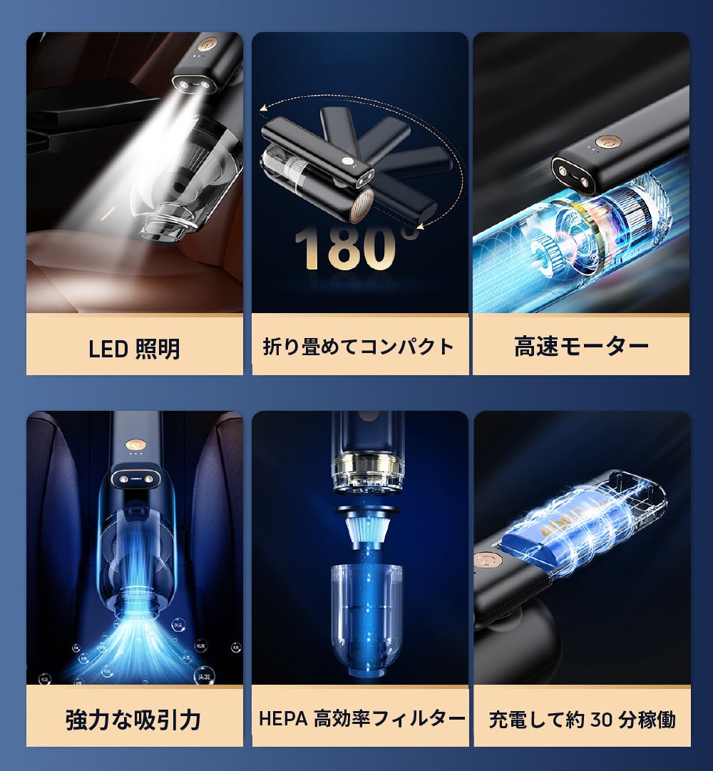 HEPAフィルターでクリーンな排気/5000PA吸引力/車、デスク周り、収納などの掃除に/非常用LED照明/USB-C充電