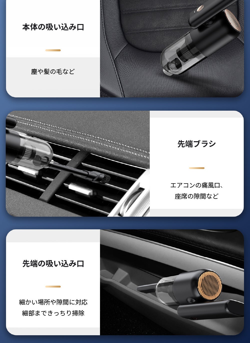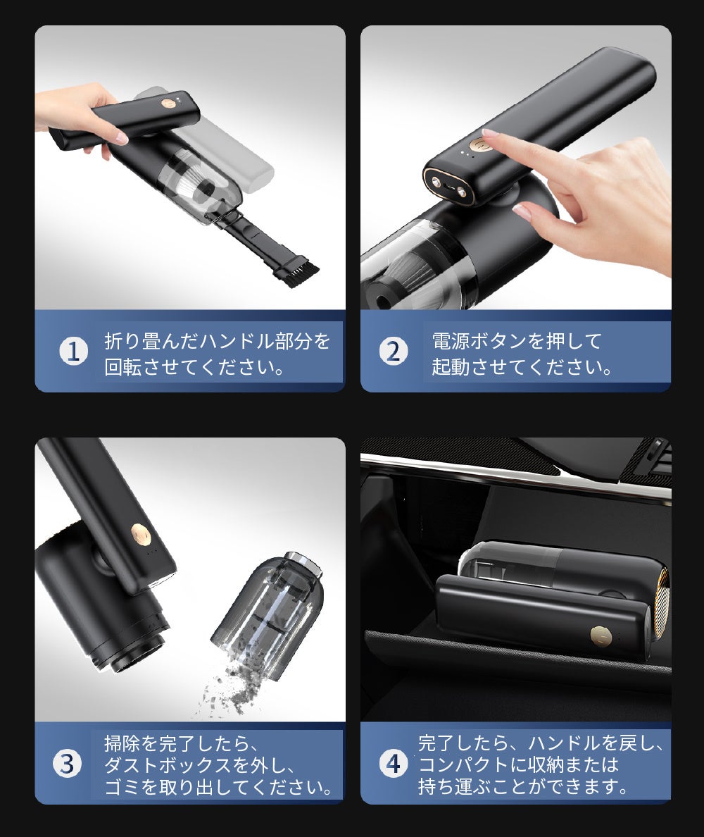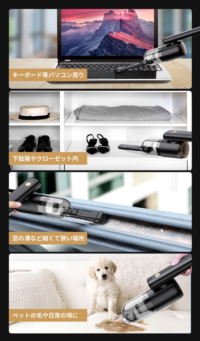 HEPAフィルターでクリーンな排気/5000PA吸引力/車、デスク周り、収納などの掃除に/非常用LED照明/USB-C充電