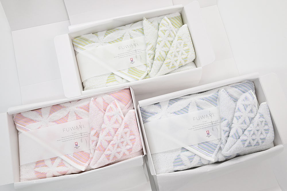 人を柔らかくつつみこむ布、人にやさしい気持ちを伝える布、人と人を温かくつなぐ布、こんな布を織り出す里…今治。「ふわり」シリーズはこの心と自然をテーマにデザインされており、白いパイルのキャンパス上には縁起が良いとされる亀甲模様にアレンジされた今治の花「ツツジ」の群生が鮮やかに描かれています。