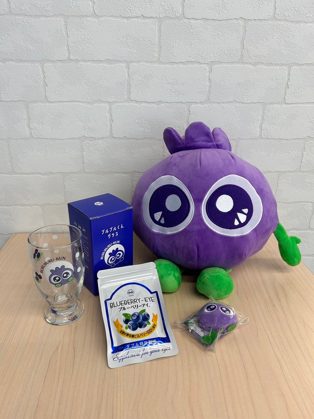 ブルーベリーアイ、ブルブルくんぬいぐるみ、ブルブルくんグラス、ブルブルくんマスコットのセット