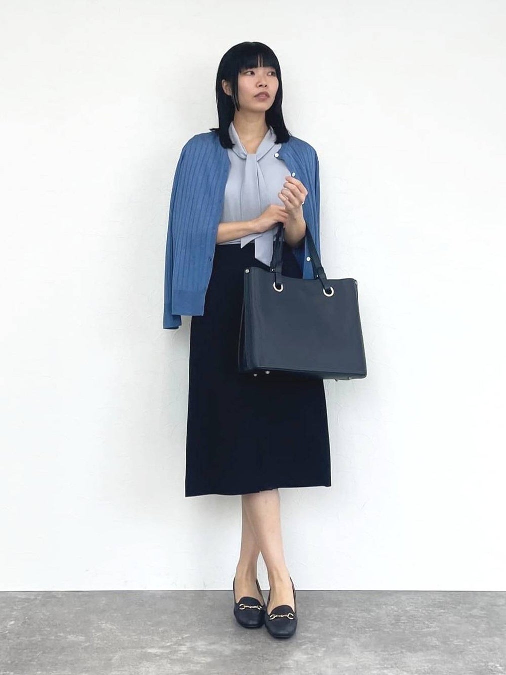 見た目にも涼やかなブルー&ネイビーのグラデーション。顔周りを明るくすることで、好印象な装いに仕上がります。室内の羽織りに重宝する薄手のカーディガンは、光沢糸の輝きが華やかで、着こなしのポイントにもなるアイテムです。