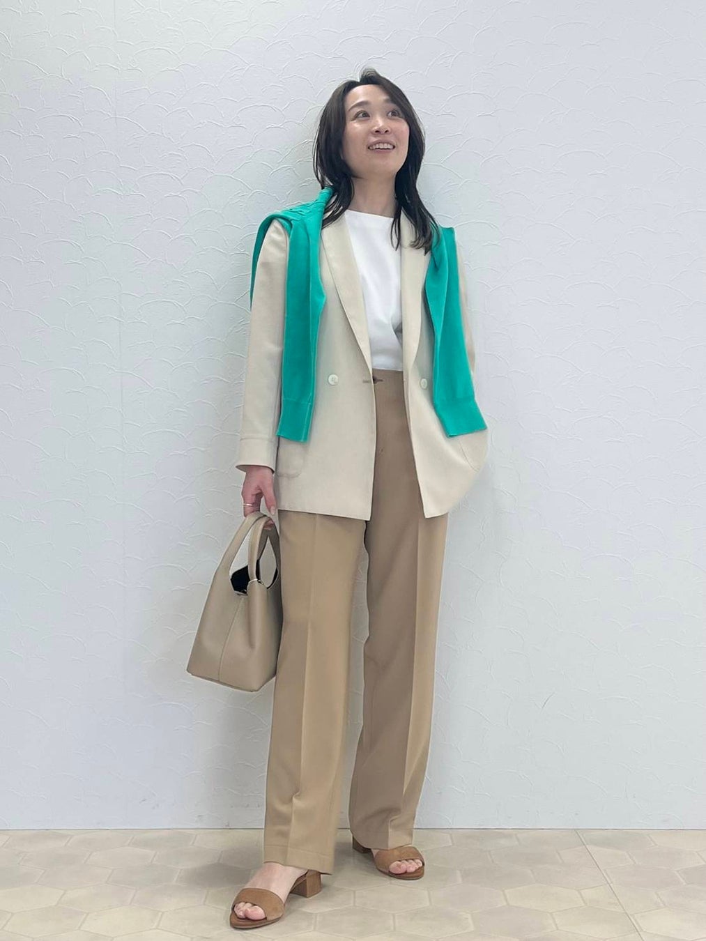 堅い印象に見えがちなジャケットスタイルは、ナチュラルカラーで優しい表情に。パンツはセンタープレス入りのストレートシルエットで、きちんと感がありながらもドライなタッチが汗ばむ季節に嬉しいアイテムです。差し色にしたグリーンのコットンカーディガンは、オフィスでの冷房対策にも。