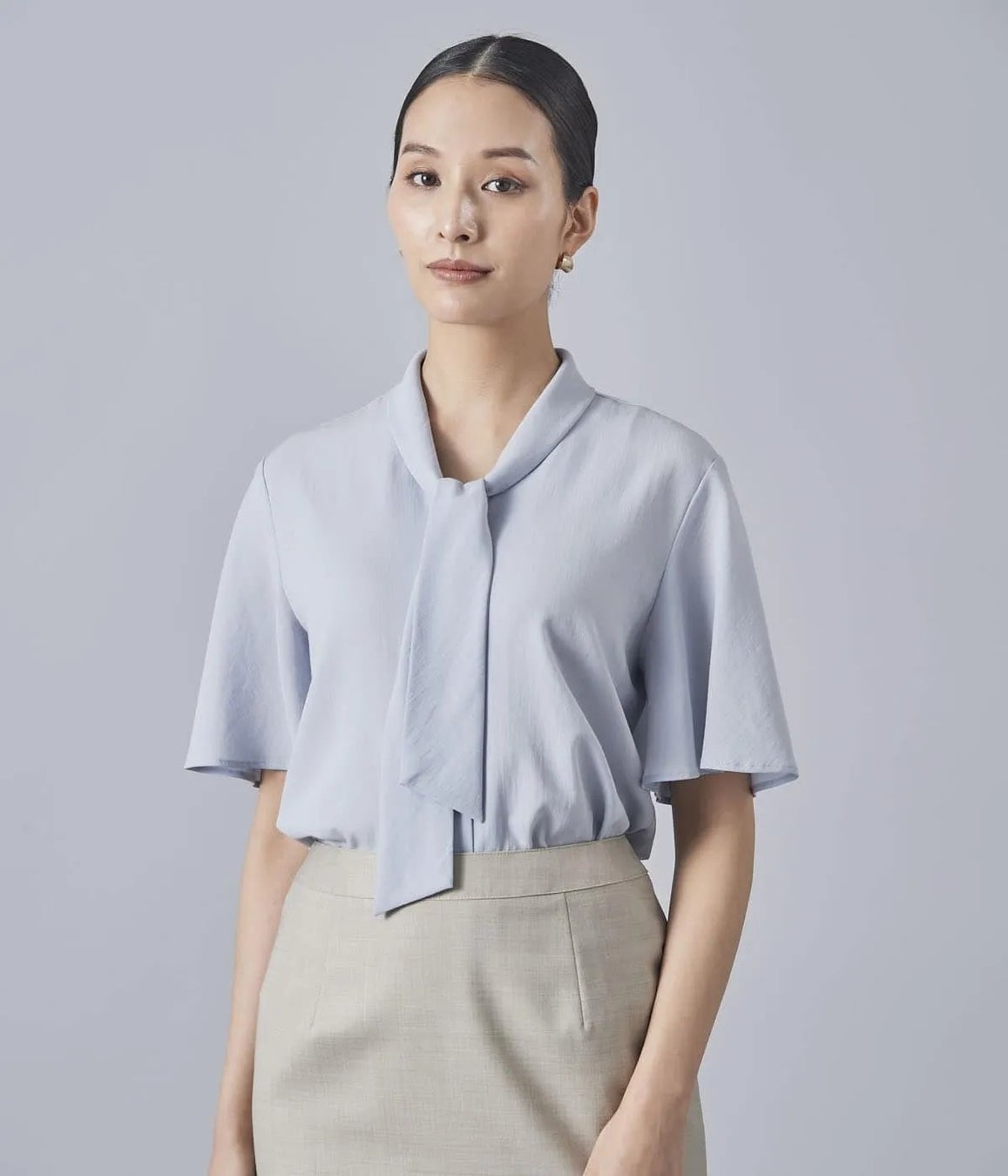 【吸水速乾】ジョーゼットクレープ 5分袖ボウタイブラウス