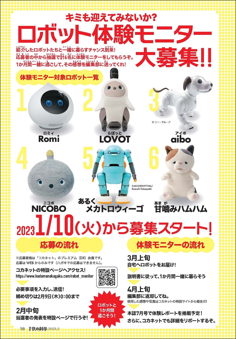 この特集に連動し、『子供の科学』のWebサイト「コカネット」では現在、ロボットを自宅に迎え入れることができる体験モニターを大募集中。かわいいロボットと1か月間過ごすことができるチャンスです!