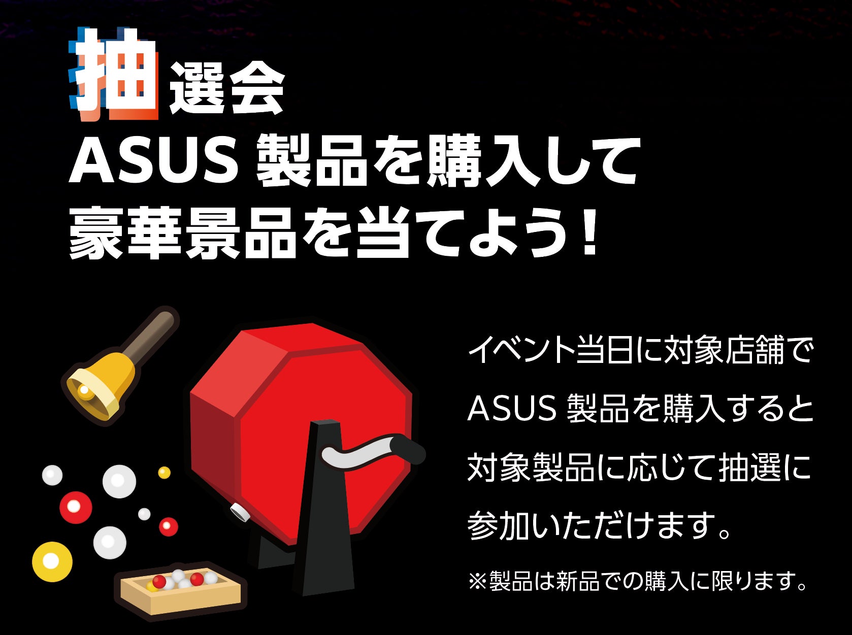 イベント当日に対象店舗でASUS製品をご購入いただき、レシートをイベント会場にお持ちいただくと、豪華賞品が当たる抽選会にご参加いただけます。