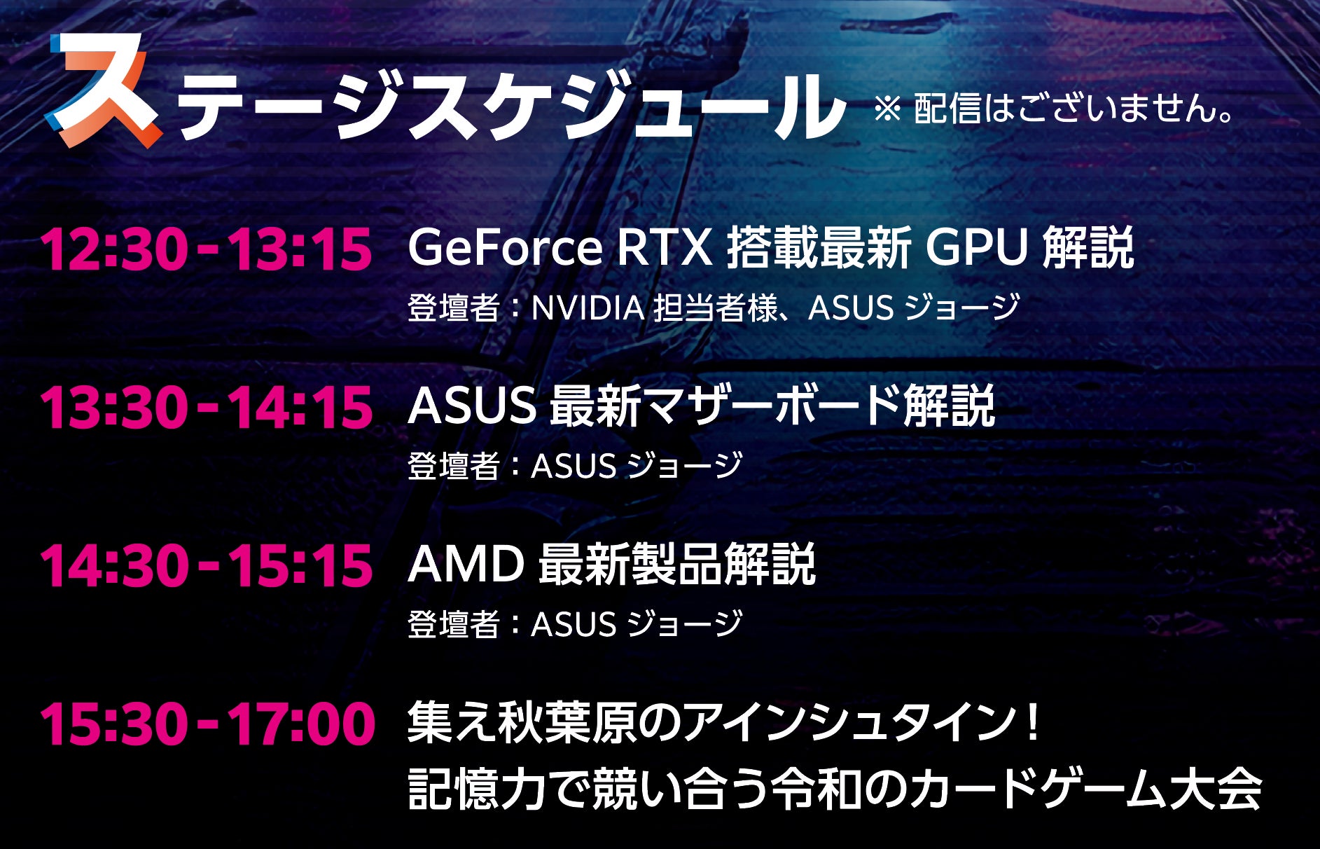 2月1日(土) 12:30~13:15 GeForce RTX搭載最新GPU解説セッション 13:30~14:15 ASUS Intel MB ジョージが語る! 14:30~15:15 ASUS AMD MB ジョージが語る! 15:30~17:00 集え秋葉原のアインシュタイン 記憶力で競い合う令和のカードゲーム大会 |