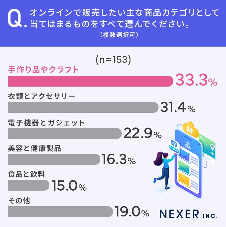 「手作り品やクラフト」が33.3%、「衣類とアクセサリー」が31.4%で並びました。