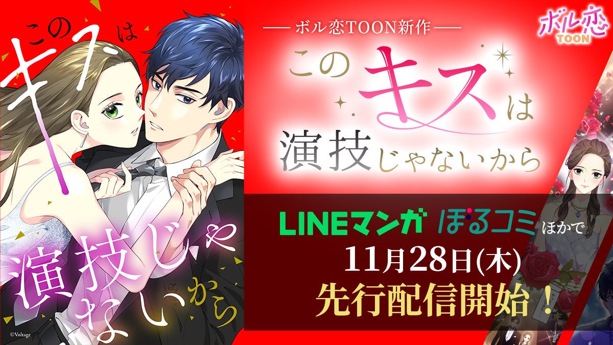 株式会社ボルテージ(本社:東京都渋谷区 代表取締役:津谷 祐司)は、タテヨミカラーコミックレーベル「ボル恋TOON」にてレーベル第3弾となる新作「このキスは演技じゃないから」を11月28日(木)にLINEマンガ、ぼるコミ他にて先行配信を開始したことをお知らせいたします。