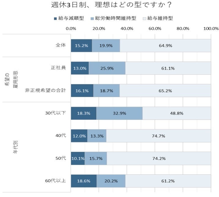 給与据え置きかつ1日の労働時間も変わらない「給与維持型」を希望する人64.9%、給与は据え置きだが総労働時間は変わらず出勤日の労働時間が伸びる「総労働時間維持型」を希望する人19.9%、休んだ日数分の給与は支給されない「給与減額型」を希望する人15.2%。
