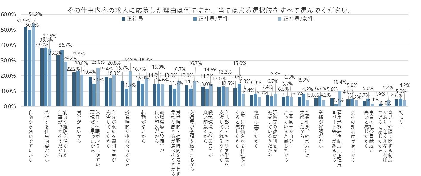 一方、「女性」のほうが「男性」よりも「残業時間が少なそうだから」が11.2pt、「休日・休暇が取得しやすい環境だと思ったから」が10.0pt、「雇用形態転換制度(正社員⇔パート等)があるから」が8.7pt高くなった。私生活との両立を考慮した仕事に、男性よりも支持が集まっているようだ。