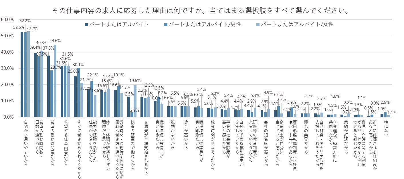 求人に応募した、パートまたはアルバイト雇用を希望する人に、自身が応募した求人を選んだ理由をきいた(複数回答)。最も多かったのは「自宅から通いやすいから」で52.5%、次いで「希望の勤務時間数・日数が選べるから」が39.4% 、「希望の勤務時間帯だから」が37.8% となった。