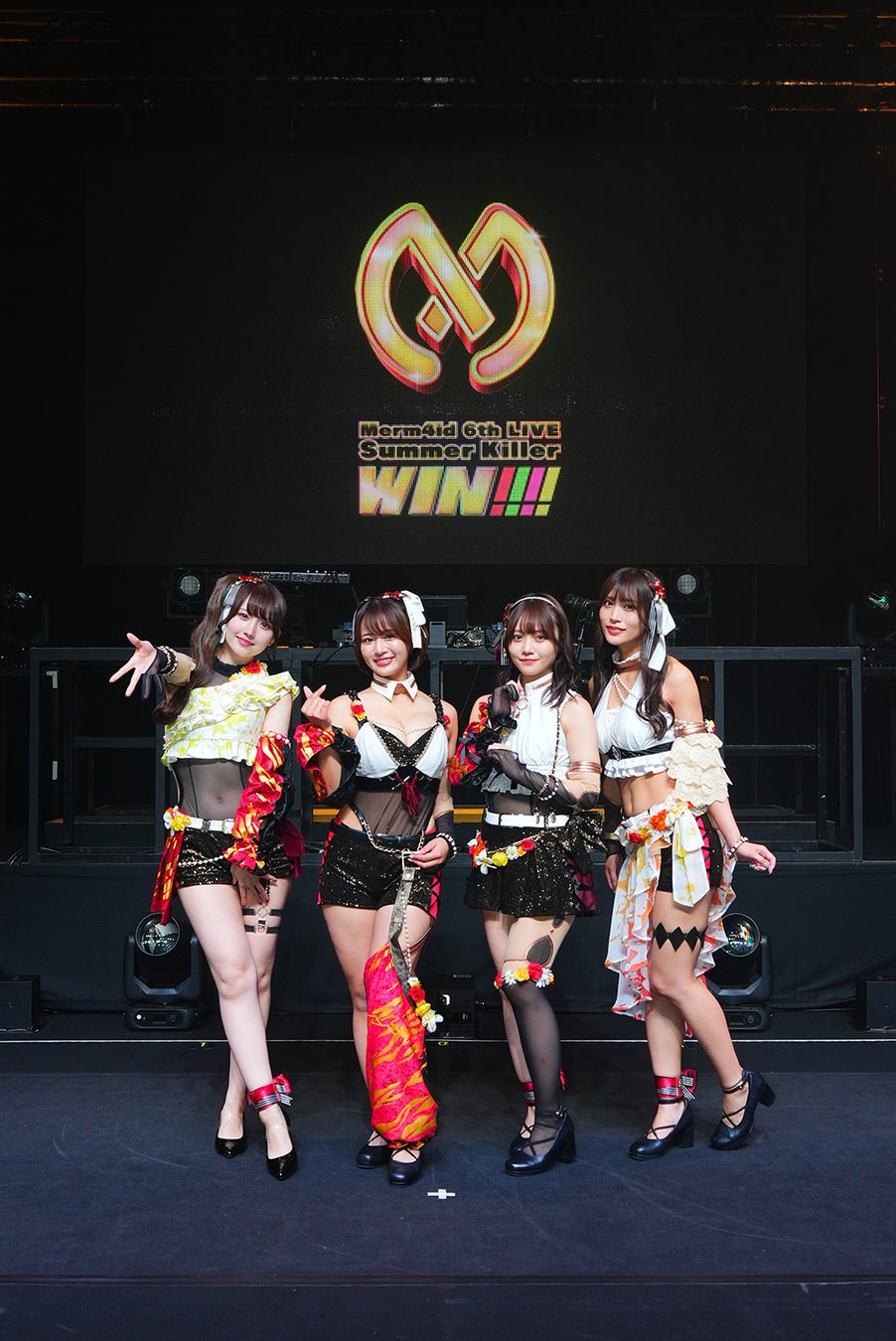 メンバー退場後、今回のライブのタイトルである「Summer Killer WIN!!!!」が映し出され徐々に「WIN-WIN」の文字に。再度Merm4idの4人が登場し、今回のライブのタイトルと同じワードを冠する新曲「WIN-WIN」をサプライズで披露しました。プロジェクト移管後、新レーベルである「DD RECORDS」から出る新曲がライブで初披露されたということもあり、会場は驚きと歓声に包まれました。