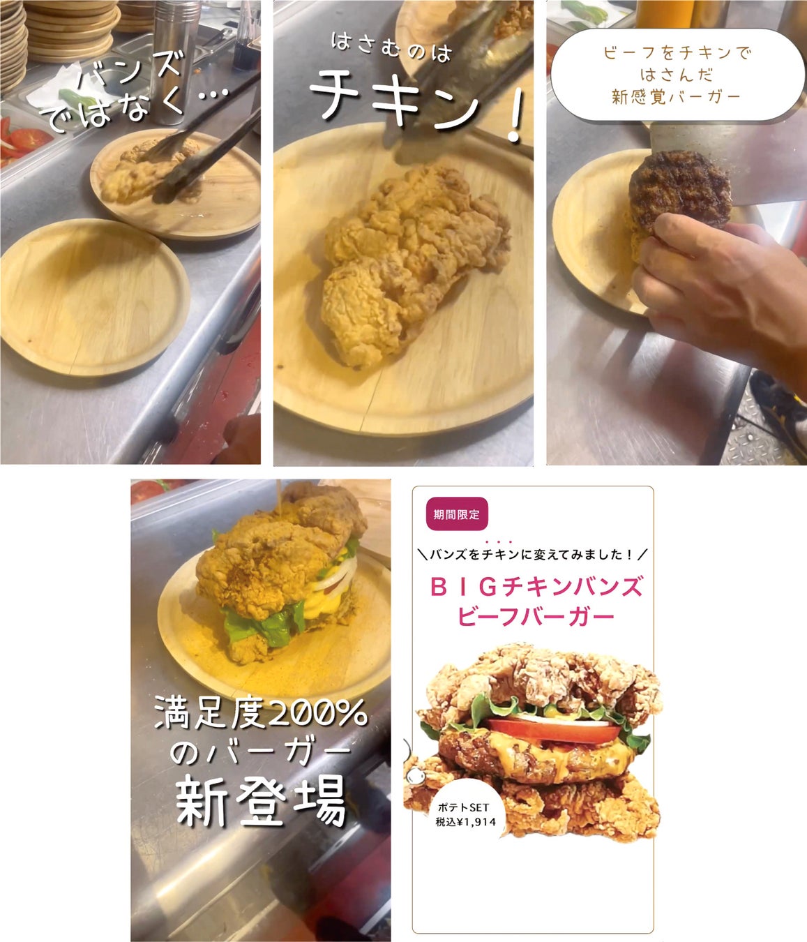 特大サイズのモチコチキンをバンズに見立て、具材を挟んだ「BIGチキンバンズビーフバーガー」は、原価度外視の背徳バーガー。