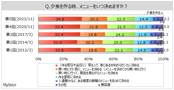 <今 回>(2023/11)https://myel.myvoice.jp/products/detail.php?product_id=30403 上記設問の他に、「朝食メニューのパターン」「夕食を作る頻度」なども聞いています。 <第4回>(2020/11)https://myel.myvoice.jp/products/detail.php?product_id=26803 <第3回>(2017/3)https://myel.myvoice.jp/products/detail.php?product_id=22404 |