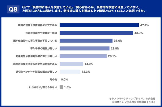 次いで「技術の信頼性や実績が不明確」、「国や他自治体の導入事例が不足している」など、判断材料や前例の不足による不安感が課題として挙がりました。こうした不安や情報不足を解消し、導入のハードルを下げるためには、検証結果や事例の共有など、導入しやすい環境整備の必要性が示唆されています。