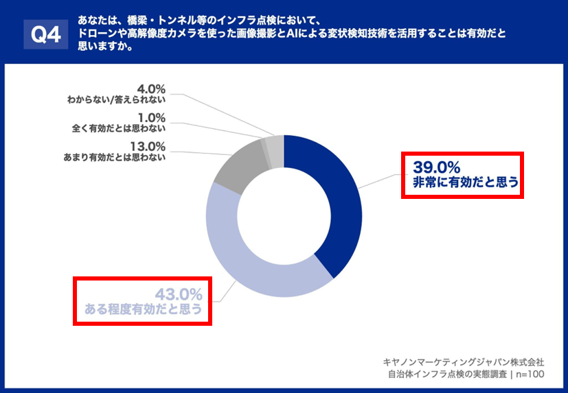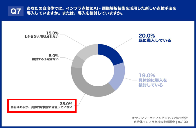ドローン、AIなどの新技術が点検に有効と8割以上の職員が評価した一方で、実際の導入・検討は4割近くにとどまりました。「近接目視と同等の精度への懸念」や「導入コストの高さ」などが障壁となり、新技術への期待と実装のギャップが浮き彫りとなっています。精度検証の透明化や導入効果の可視化といった現場が安心して導入を進められるような取り組みが必要と考えられます。