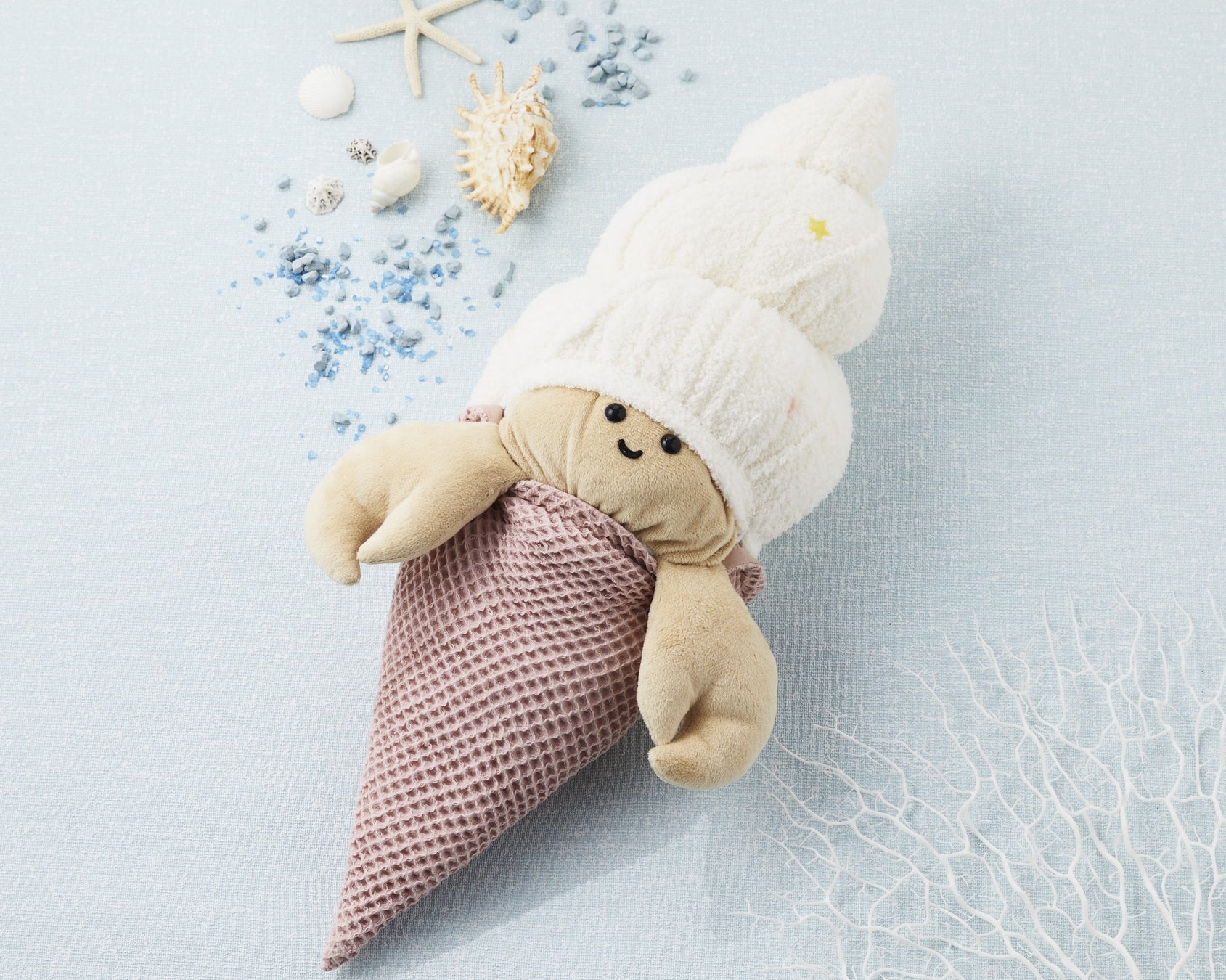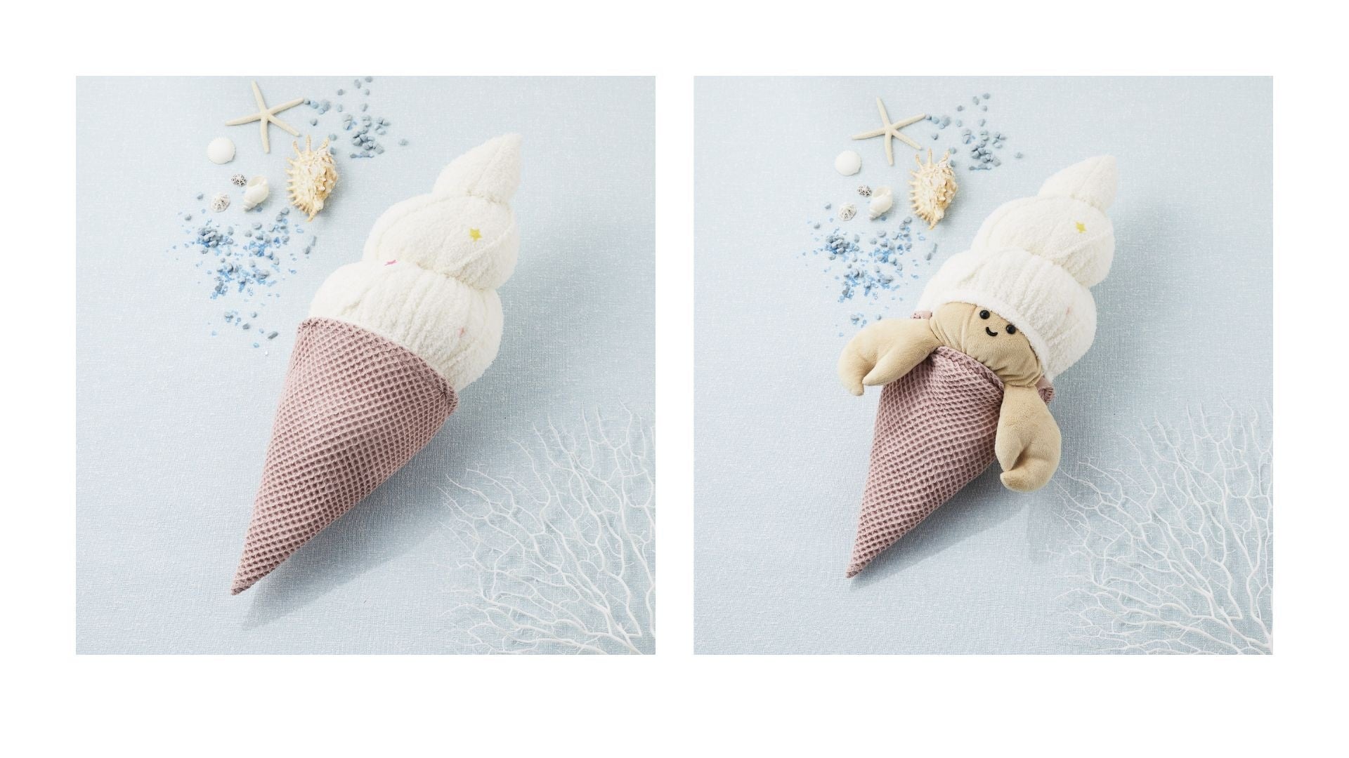 ソフトクリームとしても、ヤドカリとしても楽しめるクッションです。コーンは着脱可能。クリーム部分にあしらった星のアクセントがかわいいポイントです。